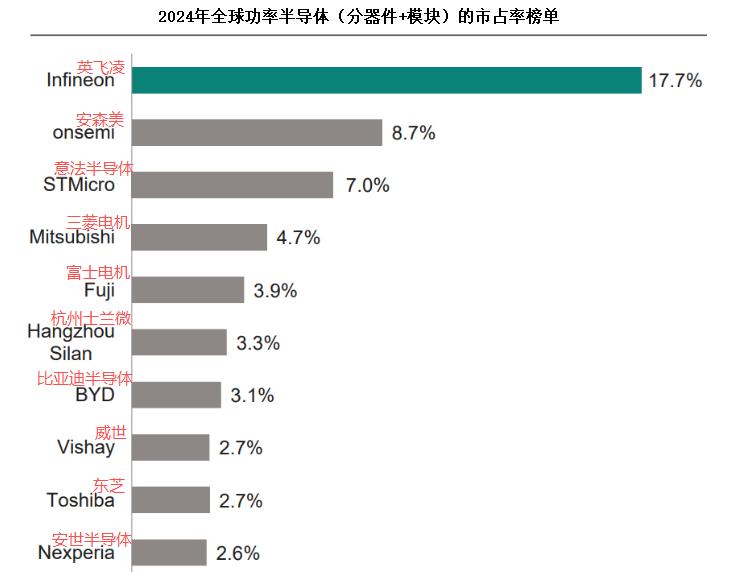 更重要的是,当前全球功率半导体市场是百花齐放的,即便英飞凌,安森美居于前列,但2024年两龙头的合计市占率只有26%,不像逻辑、存储芯片那样形成垄断格局。
