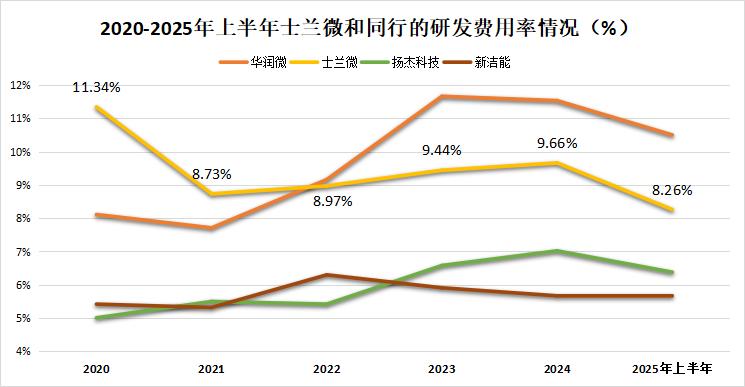 2020-2024年,其研发费用从4.29亿元增至10.34亿元,2025年上半年也达到4.78亿元,而且研发费用率常年保持在10%左右,整体水平高过扬杰科技、新洁能等同行。