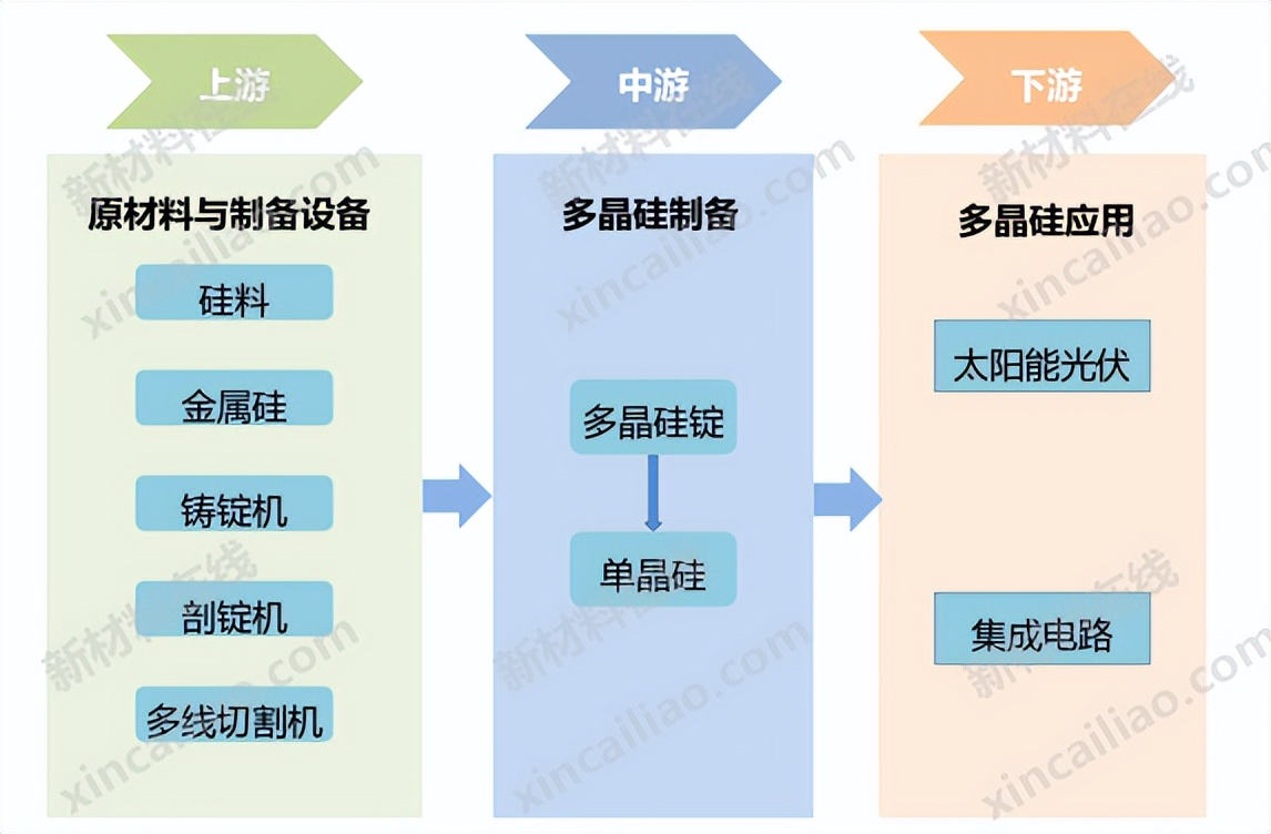 多晶硅料:核心原料,需纯度≥99.9999%的高纯度多晶硅硅片:单晶硅棒(占比超90%,效率更高)/多晶硅锭切片,厚度已降至150μm以下辅材:光伏玻璃、EVA/POE胶膜(封装电池片)、银浆(电极导电)、石英坩埚(硅熔炼容器)中游:电池片与组件