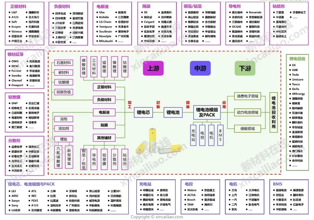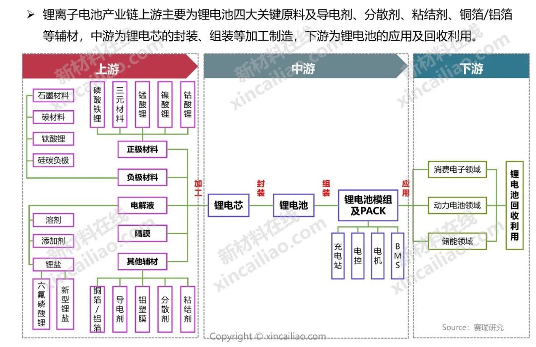 电芯:正负极/电解液/隔膜封装成单体(方形/圆柱/软包),工艺含涂布、卷绕/叠片电池包:电芯集成+ BMS(电池管理系统)+热管理系统下游:应用场景