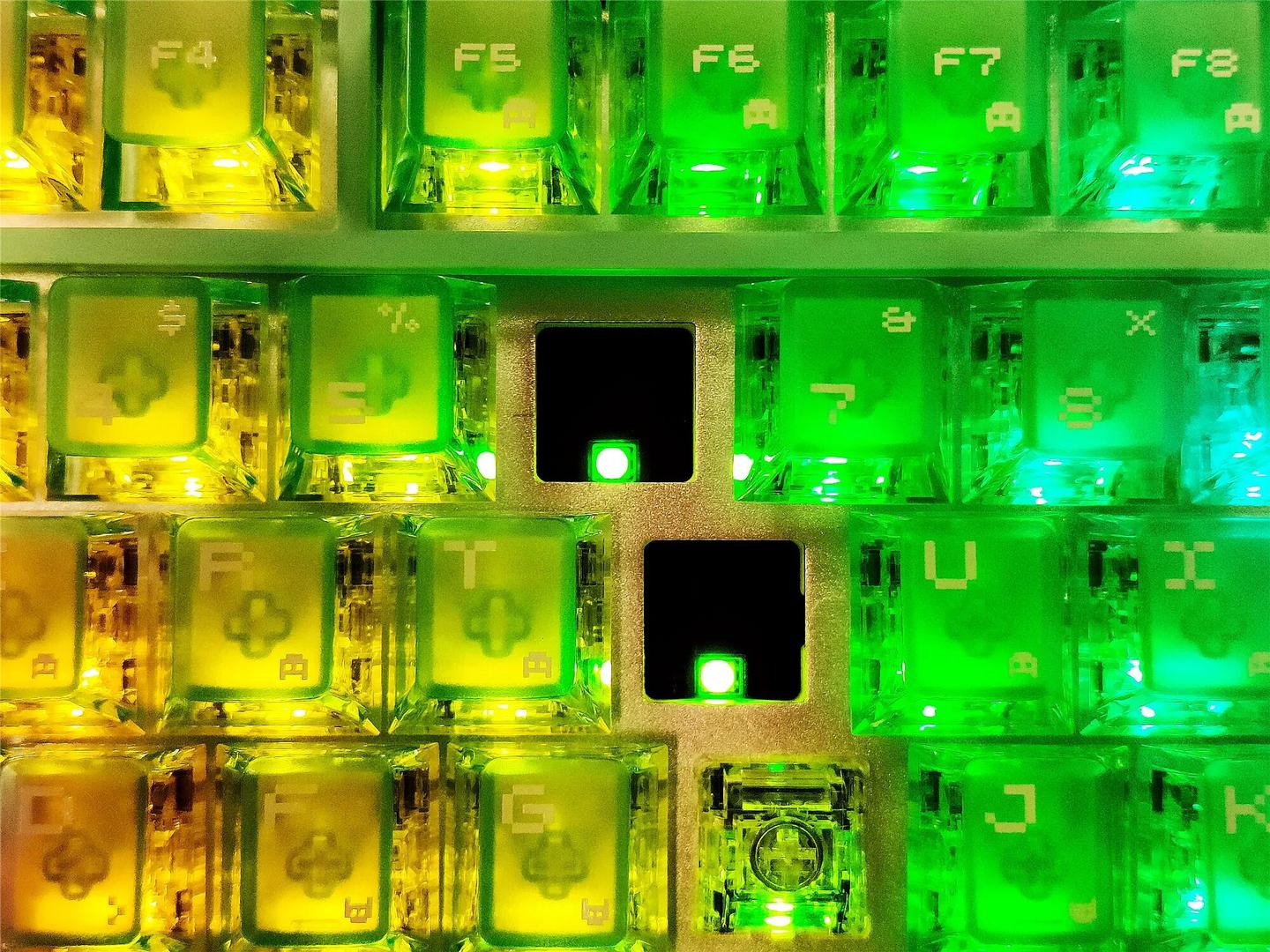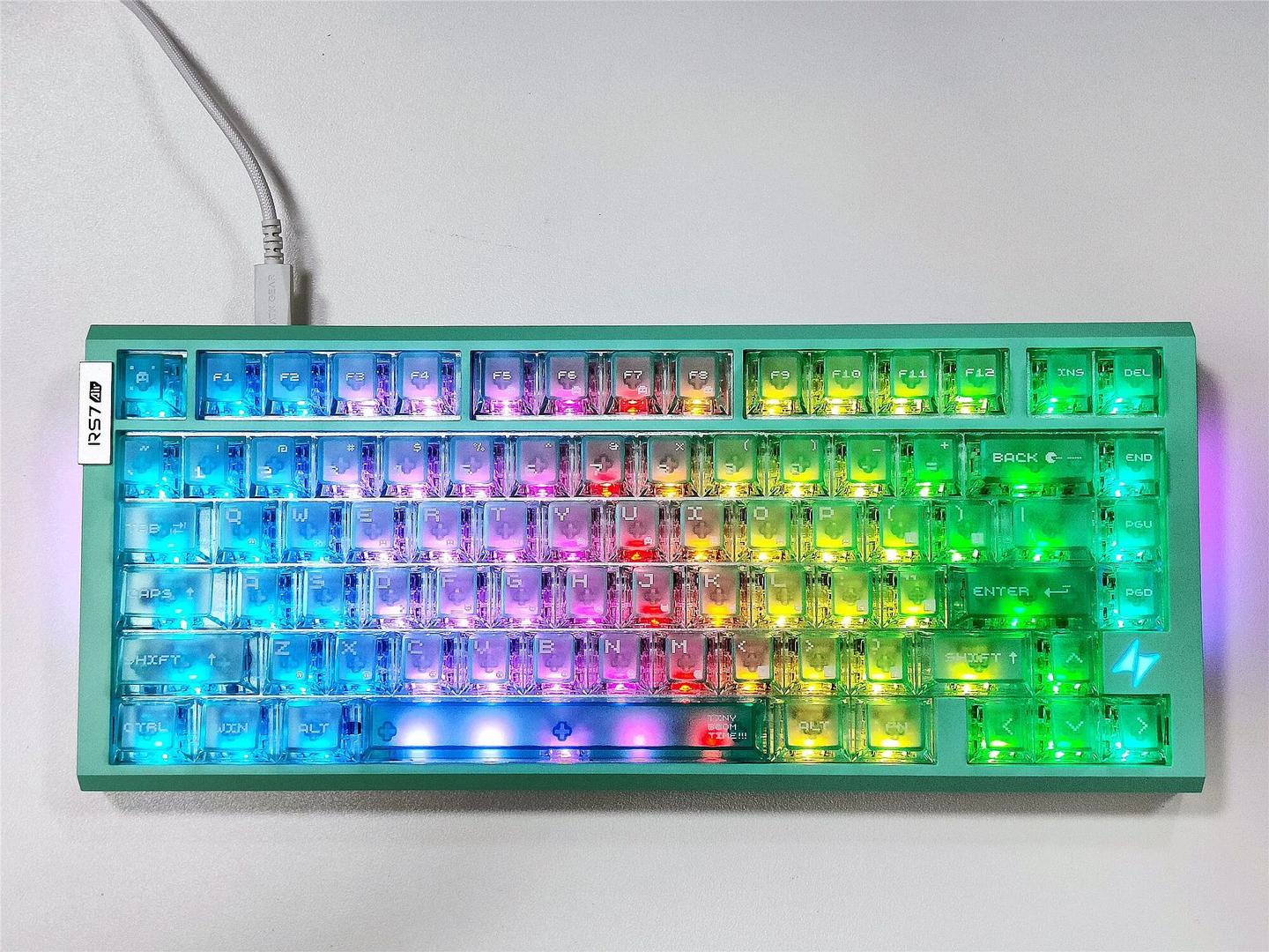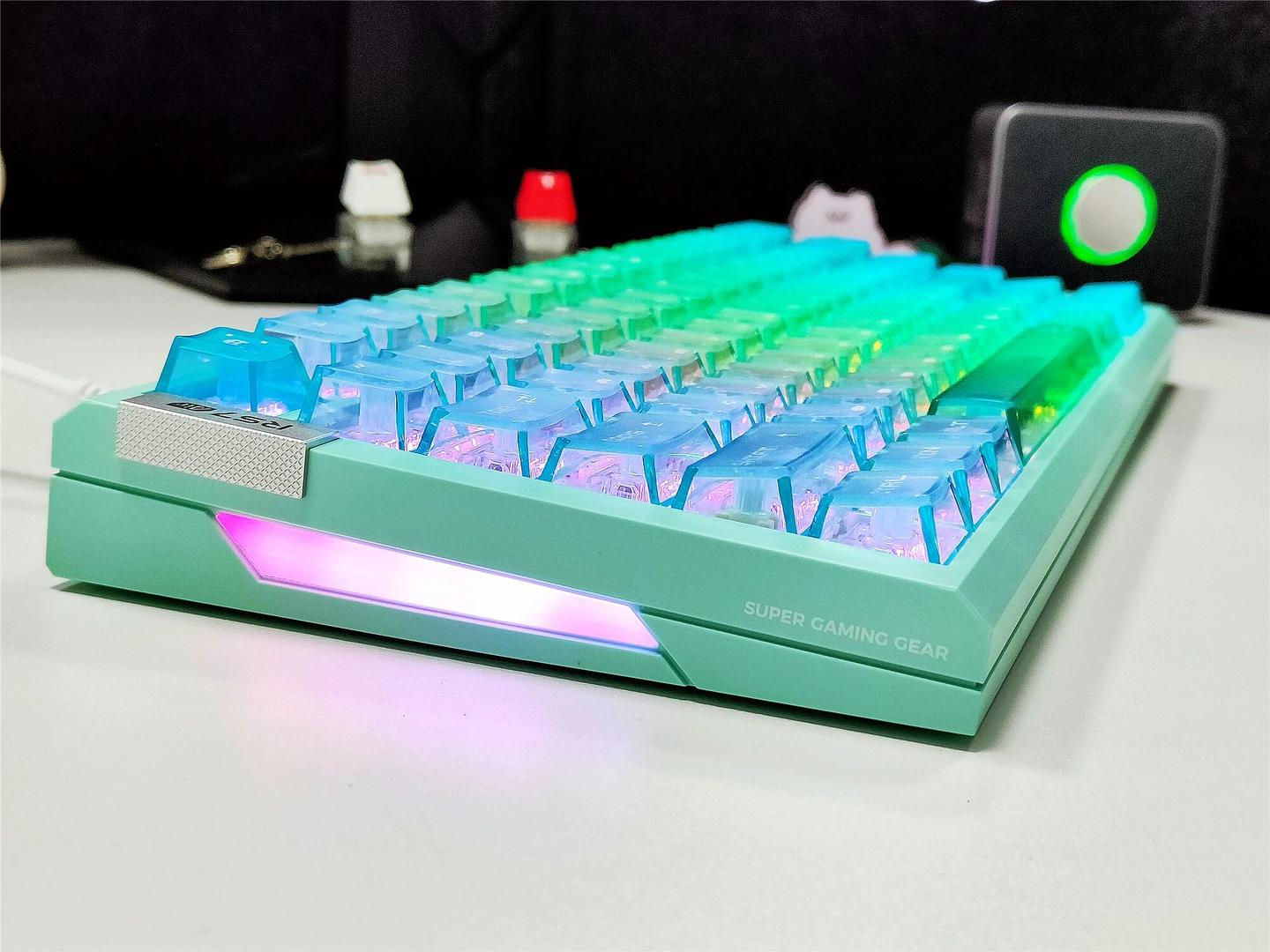 键帽是高透雾面 PC 材质的像素大字符设计,顶部雾透处理太良心了,光线透出来均匀又柔和,完全不刺眼。最惊喜的是空格键居然有五颗灯珠,配合 1600 万色 RGB 动态光效,晚上关灯打游戏时,湖水绿外壳加上柔和的灯光,氛围感直接拉满,还能跟着音乐律动跳动,颜值党表示狂喜。