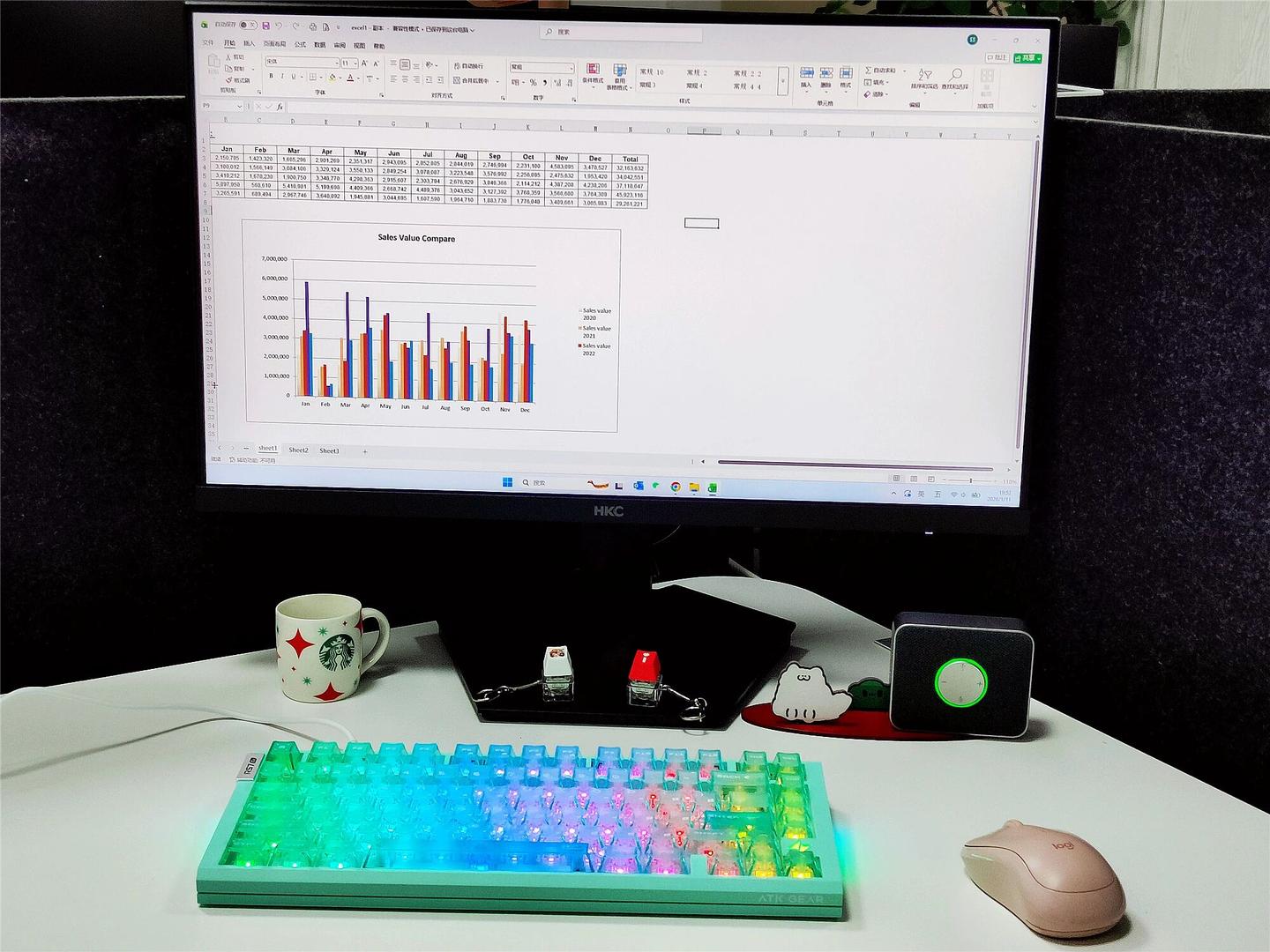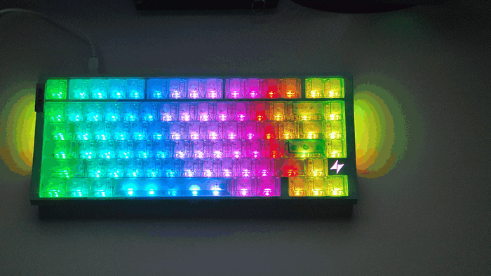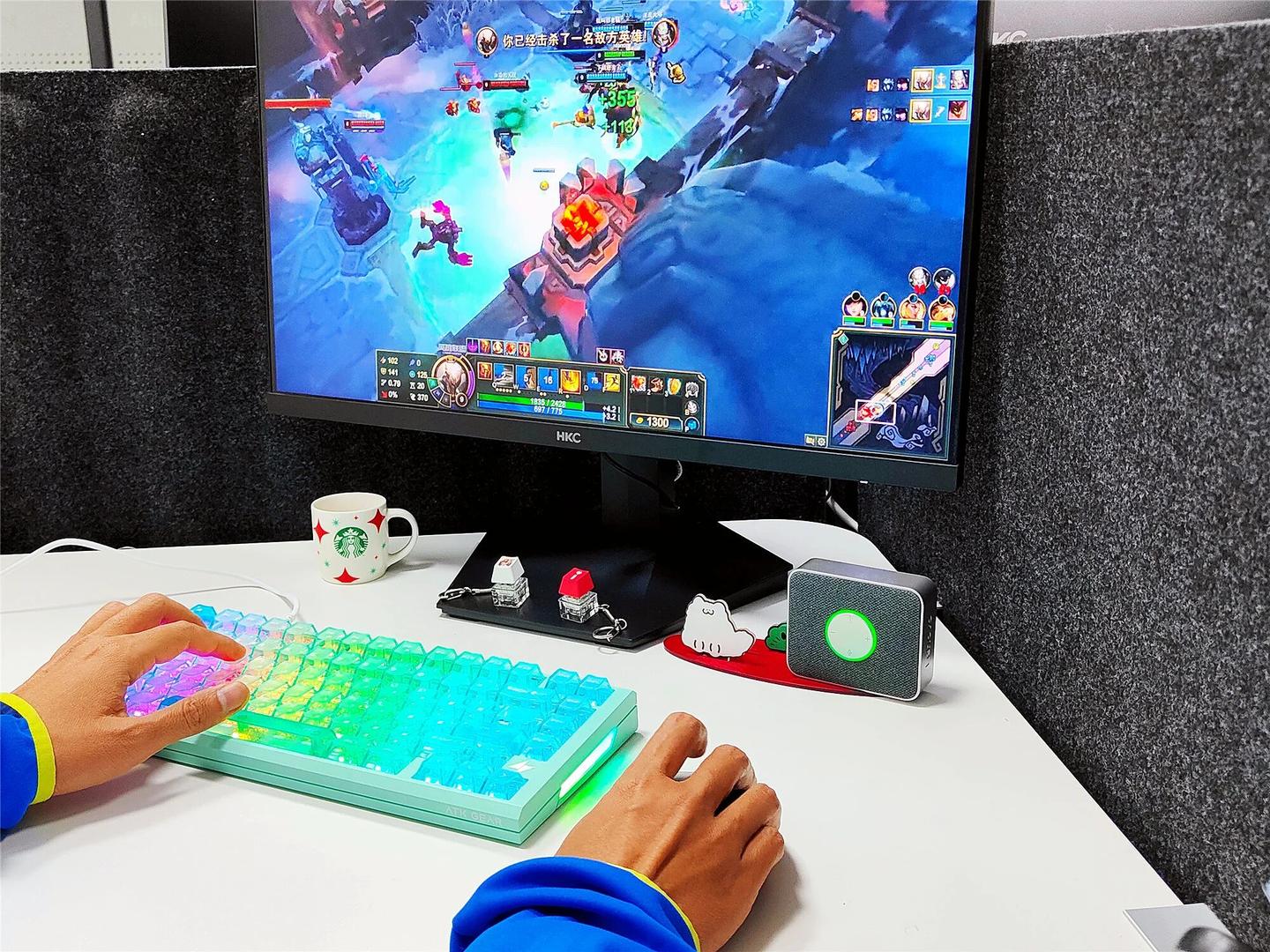 键帽是高透雾面 PC 材质的像素大字符设计,顶部雾透处理太良心了,光线透出来均匀又柔和,完全不刺眼。最惊喜的是空格键居然有五颗灯珠,配合 1600 万色 RGB 动态光效,晚上关灯打游戏时,湖水绿外壳加上柔和的灯光,氛围感直接拉满,还能跟着音乐律动跳动,颜值党表示狂喜。