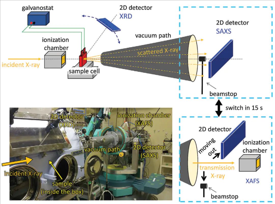 过去二十年,基于同步辐射的原位联用技术迅速发展。X.-L. Wang等人使用同步辐射XRD和SAXS方法研究了锆基大块金属玻璃从非晶态向晶态转变的相变行为,实验在美国橡树岭国家实验室和阿贡国家实验室进行,主要时间分辨Mauro Povia及其同事开发了结合SAXS和XAS的技术,研究在实际运行条件下碳载铂纳米粒子燃料电池催化剂的退化过程。他们开发的新实验装置可以在几分钟内切换SAXS和XAS技术,同时获取催化剂在操作条件下形貌和组成的变化信息。