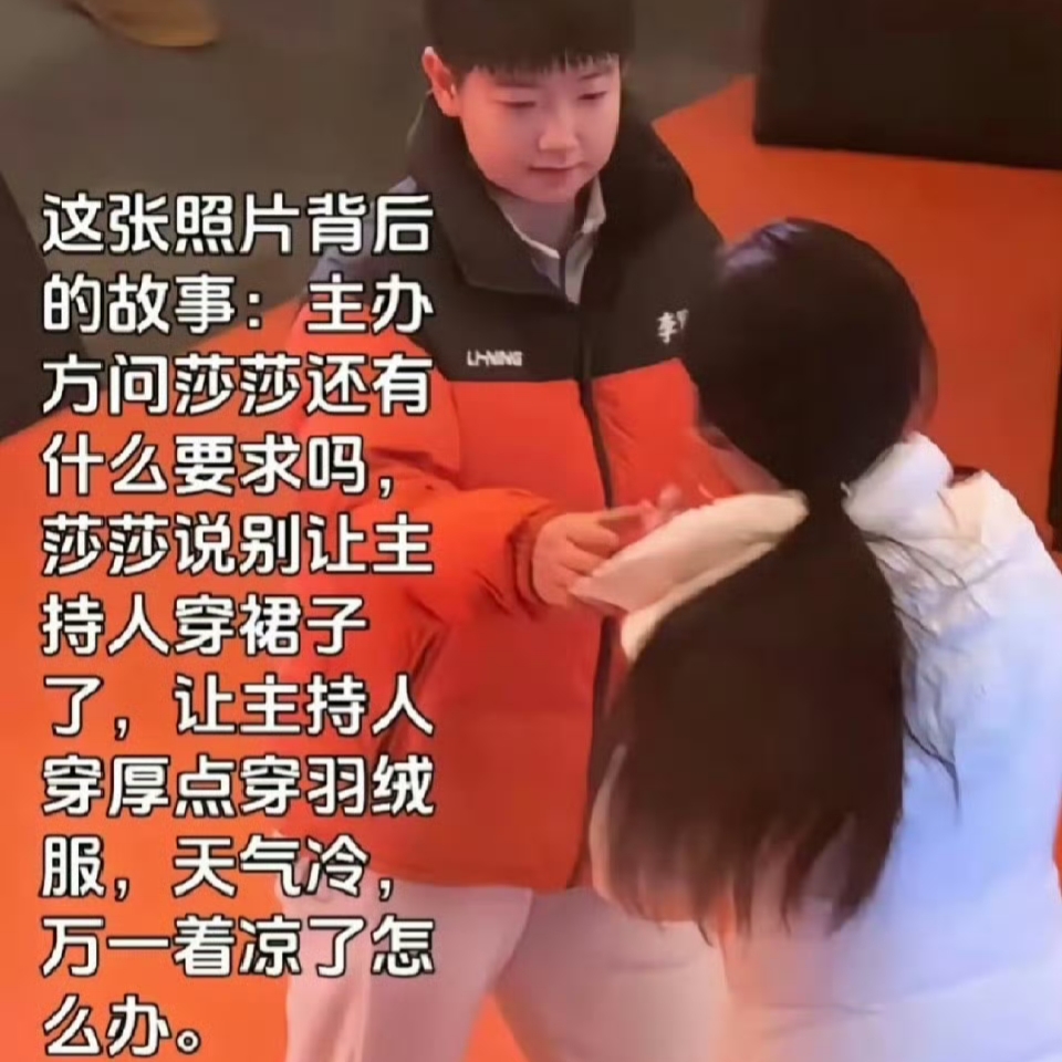 这一变化的起点,就要从2024年年底乒乓球运动员孙颖莎的一场户外活动开始说起。正值年底,户外寒风刺骨,孙颖莎注意到了要主持这场活动的主持人杨子畅。寒风中,即将上台主持活动的主持人穿着单薄的礼服。很久以来,女主持人在寒冬中穿着单薄礼服微笑主持,被视为“专业”。