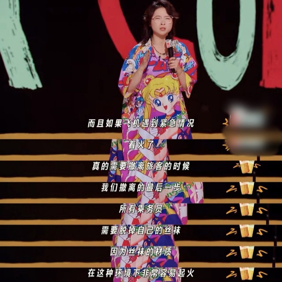这样的事情还有,例如脱口秀演员嘻哈在节目中吐槽空姐的服装:短裙的不便、高跟鞋的不舒适、丝袜的危险。