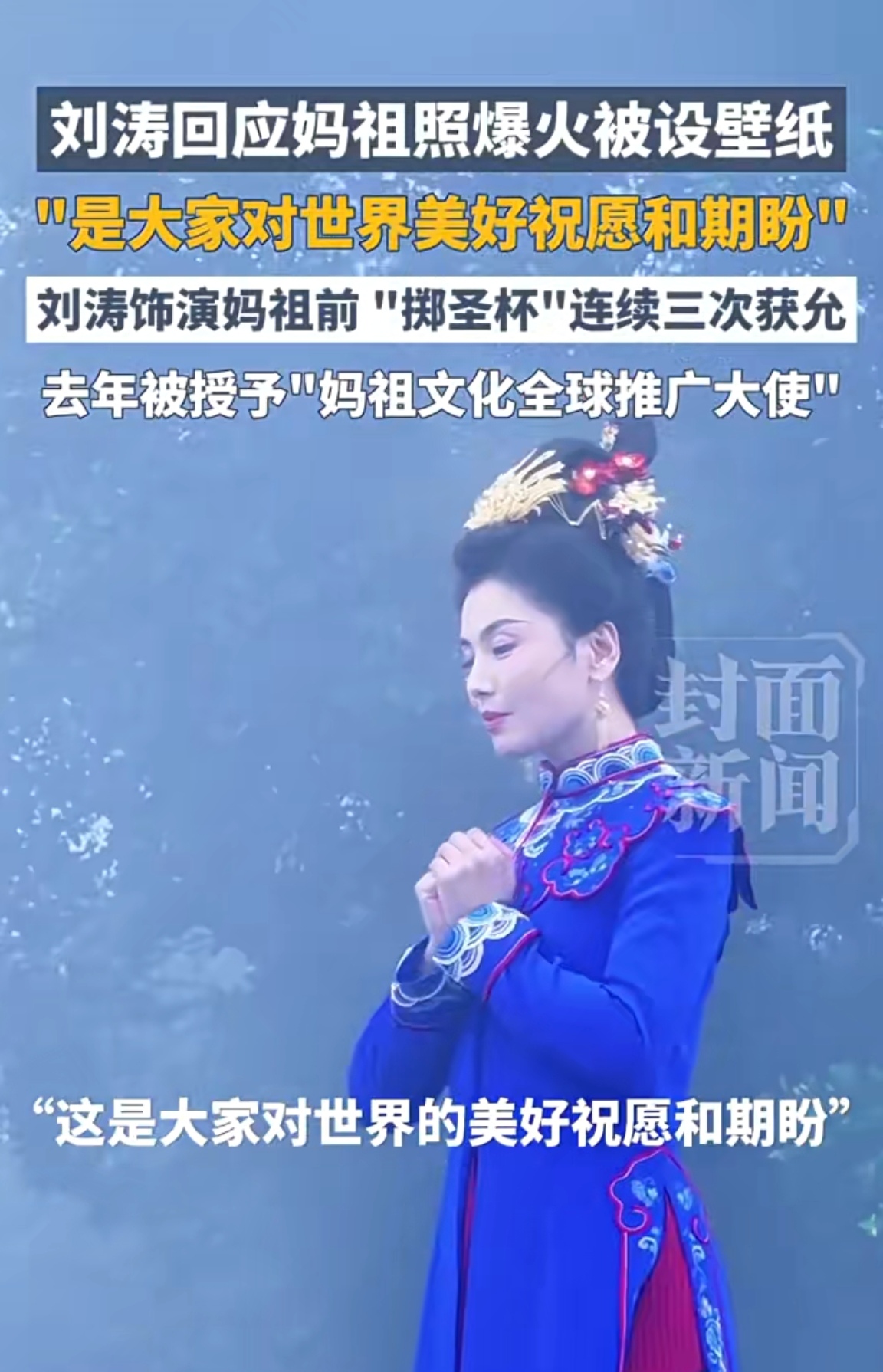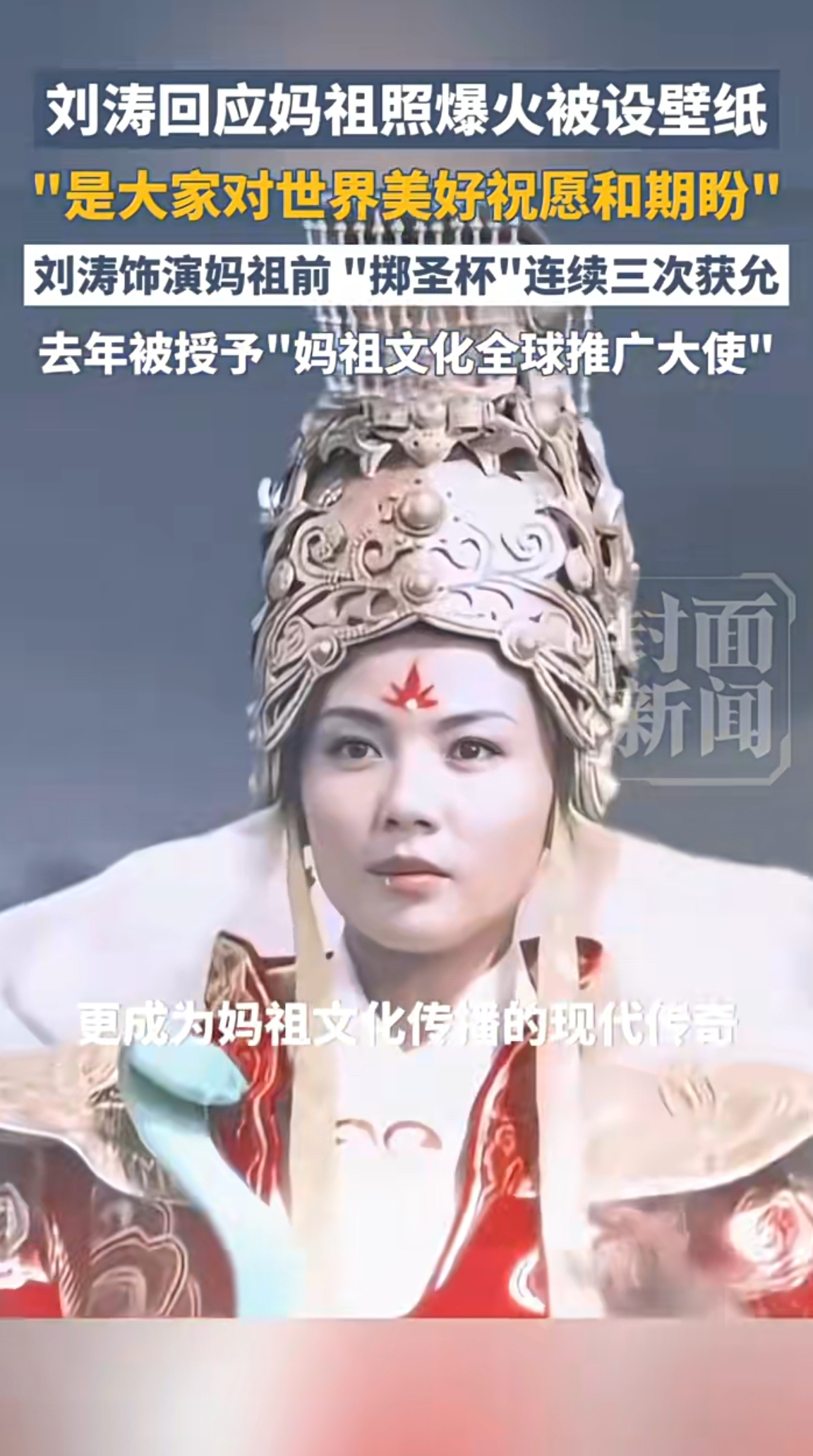 02 为何是刘涛?一场跨越14年的“天选”传奇刘涛版妈祖之所以能成为深入人心的文化符号,绝非偶然,而是一场始于“缘分”、成于“敬业”的长跑。“天选之人”的神圣渊源:时间回溯到2012年电视剧《妈祖》开拍前。剧组遵循闽南民俗,前往湄洲岛妈祖祖庙通过“掷圣杯”来请示神明选定主角。原定主演未能成功,而轮到刘涛时,她竟连续三次掷出象征神明允准的“圣杯”。更巧合的是,第三掷时一道光束恰好落在她身上,这一幕被在场信众视为“妈祖显灵认可”,为她披上了一层神圣的合法性。“国泰民安”的形象契合:剧中的刘涛,面容端庄慈悲,气质温润大气,被观众誉为“国泰民安脸”。她不仅外形符合大众对神明的想象,更在拍摄中展现了极高的敬业精神。在零下5℃的湄洲湾赤脚拍摄“踏浪”戏码,磨穿三双草鞋,这种“人戏合一”的投入,让她的演绎极具说服力。官方与民间的双重认证:2025年,正值妈祖诞辰1065周年,刘涛被莆田市授予“妈祖文化全球推广大使”和“莆田文旅推荐官”的称号。她在祭典上身着紫霞华裳、虔诚献寿桃的造型,再次引爆网络,成为了这次“壁纸风潮”的直接导火索。03 从“剧照”到“信仰”:现代人的精神图腾网友将刘涛的妈祖照设为屏保,这究竟是一种怎样的心理?这其实是在快节奏、高压力的现代生活中,人们寻找的一种心理慰藉和“情绪定海神针”。视觉化的安全感:在充满不确定性的时代,这张充满祥和之气的照片,成为了安全感的具象化载体。看着屏幕上的慈悲面容,仿佛就能获得一份内心的平静。数字化的仪式感:对于无法时常亲临庙宇的年轻人来说,设置屏保成了一种低成本的“随身仪式”。它不需要复杂的流程,却能时刻提醒自己心存善念、祈求平安。集体情感的投射:正如刘涛所言,这背后是大家对“国泰民安、风调雨顺”的集体期盼。这张壁纸,已经超越了追星的范畴,成为了一个连接传统信仰与现代生活的文化纽