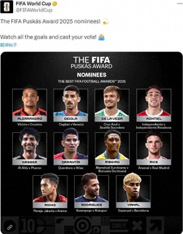 官方:赖斯上赛季对皇马的欧冠比赛中打进的第二个直接任意球被提名为了年度普斯卡什奖候选!
