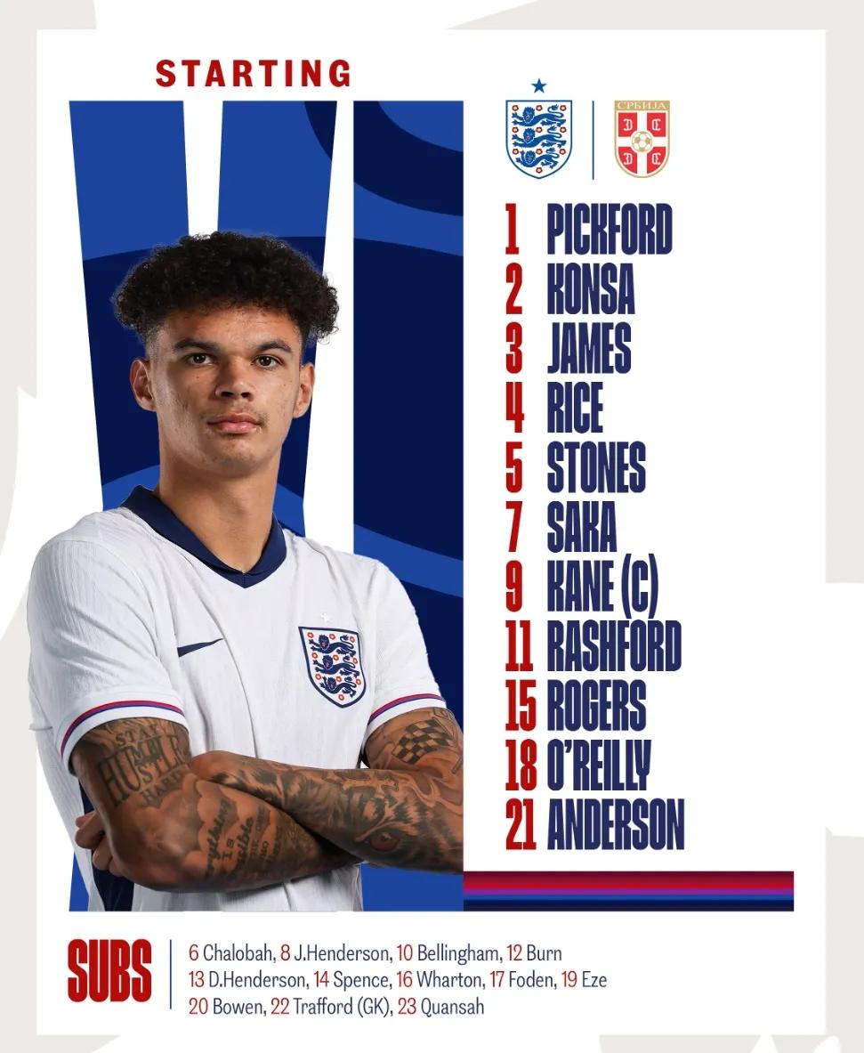 萨卡和赖斯首发出战了英格兰对塞尔维亚的世预赛。
