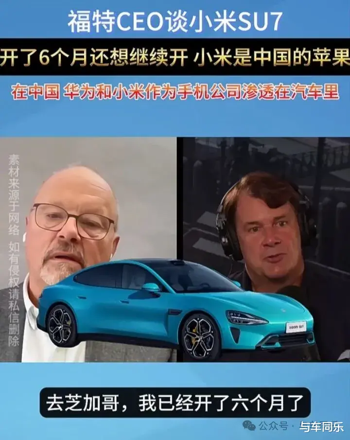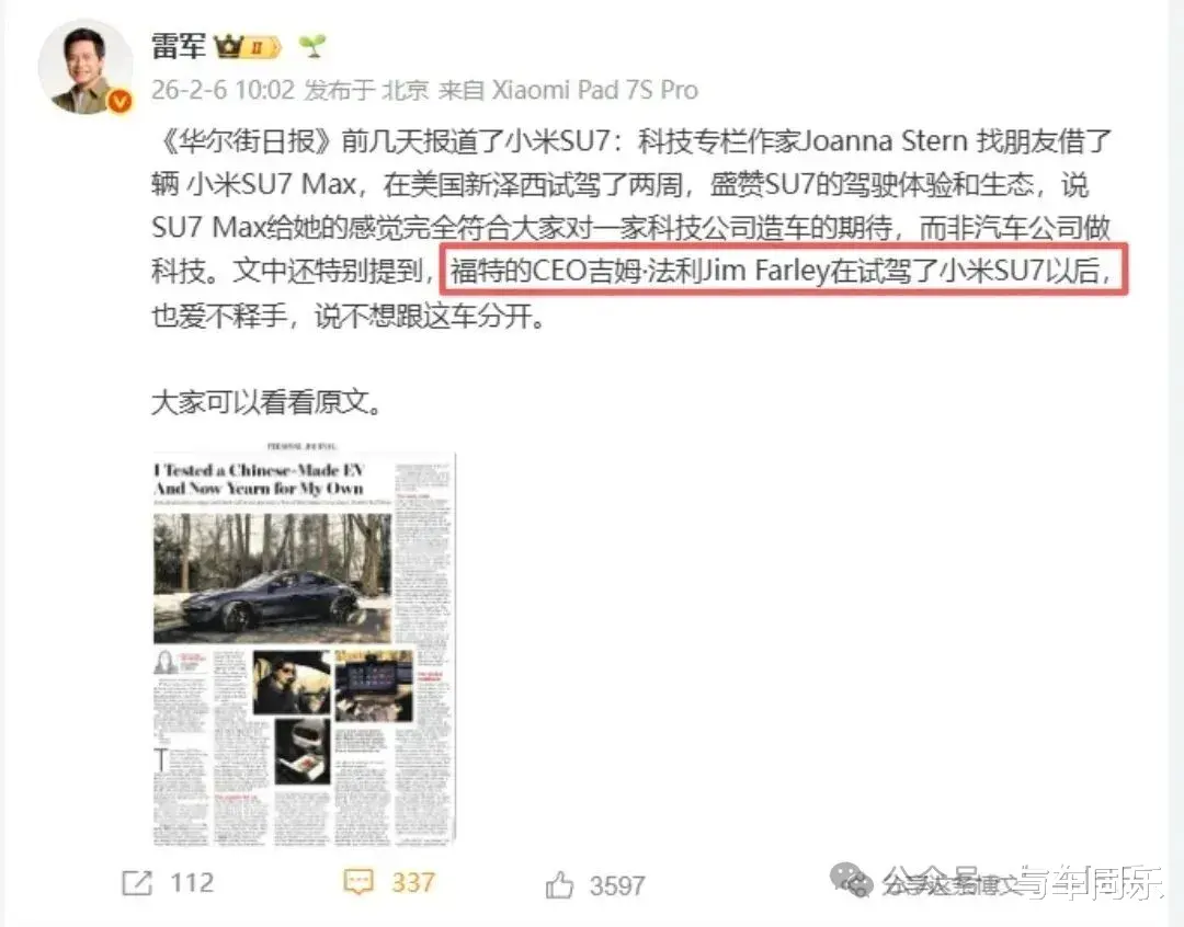 在使用过程中,吉姆・法利将小米比作“中国的苹果”,称赞SU7技术先进、智能化水平超越欧洲豪华品牌,还说过:开过SU7后,不想再开原来的车。