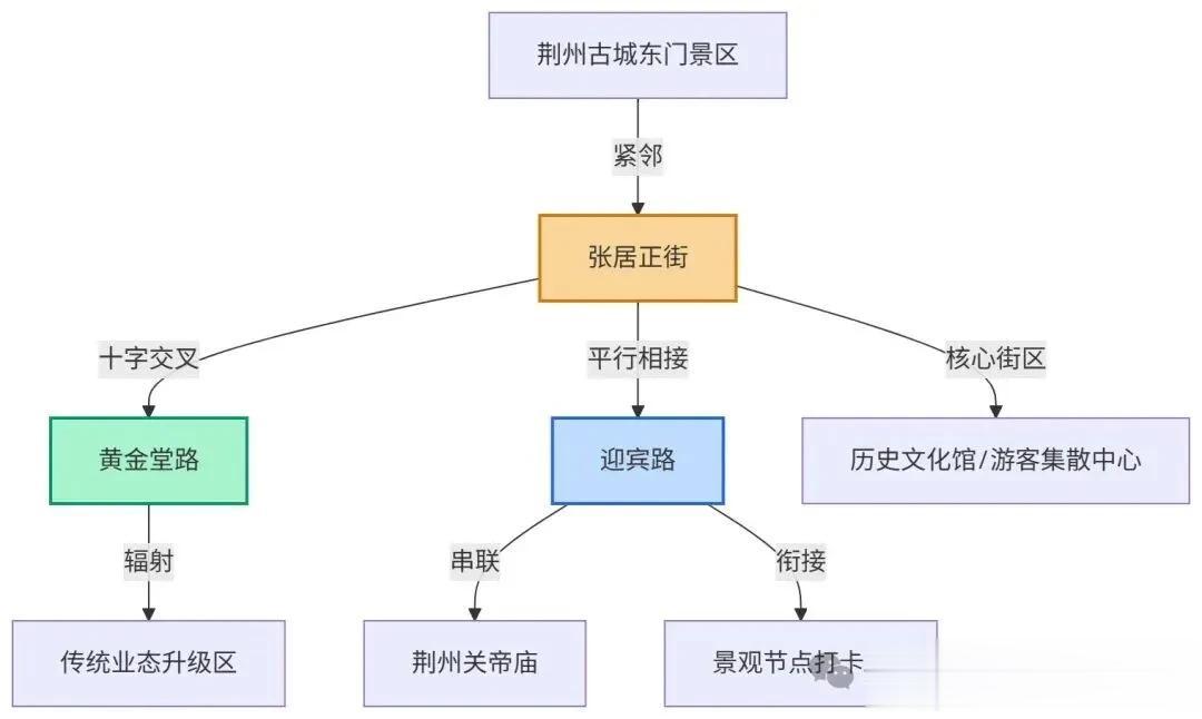 然而,荆州的雄心不止于此。根据规划,张居正街西街、黄金堂路和迎宾路将形成联动发展态势。黄金堂路与张居正街十指交叉,迎宾路则与张居正街平行相接,这三条道路共同串联起古城东门景区和荆州关帝庙两大核心景点,构筑起古城文旅发展的新骨架。