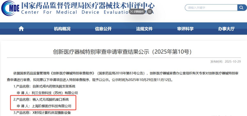 上海阶梯医疗科技有限公司自主研发的“植入式无线脑机接口系统”正式进入国家药品监督管理局医疗器械技术审评中心(CMDE)的创新医疗器械特别审查程序(即“绿色通道”)。