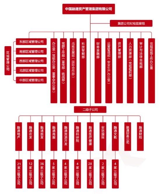 据融通集团官网介绍,该集团的经营范围主要包括“房地产、农业、酒店及旅游业、商业服务、资源开发、科技服务、医疗健康、安保服务、文化教育、财务、保险”等领域;设有11家二级子公司,分别是融通地产、融通农发、融通旅发、融通商服、融通资源开发、融通医疗健康、融通财险、融通科研院、安防国际、融通文教、融通财务。