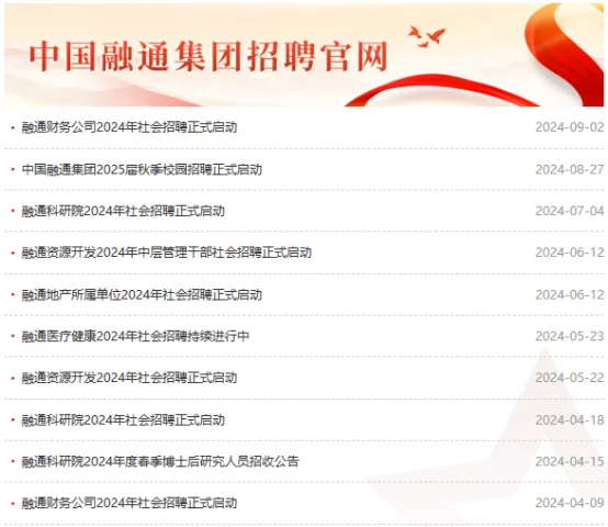 中国融通非常重视吸纳新鲜血液,每年都会面向应届毕业生开展校园招聘活动。招聘岗位涵盖医疗卫生类、机械电子类、计算机类、金融财务类、行政文职类、法律审计类、酒店餐饮类、农业生产类、出版传媒类、资产管理类等多个领域。招聘专业涵盖13个学科门类:工学、医学、理学、法学、农学、文学、经济学、管理学。除了每年常态化的春季和秋季招聘,也会固定开展社会招聘,公司遍布全国24个省市,项目延伸至全国31个省市,无论你是在北京、上海还是沈阳的优秀人才,都有机会加入。2024年的秋季招聘共招671人,468个职位。