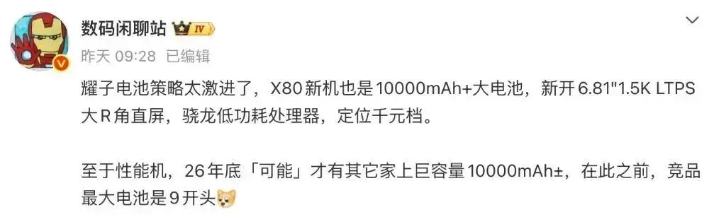 另外还有爆料提到过,“耀子电池策略太激进了,X80新机也是10000mAh+大电池,新开6.81"1.5K LTPS大R角直屏,骁龙低功耗处理器,定位千元档。至于性能机,26年底「可能」才有其它家上巨容量10000mAh±,在此之前,竞品最大电池是9开头”。