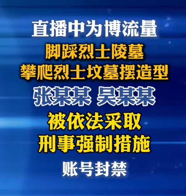 两人的恶劣行为很快被警方察觉。广德市公安机关在工作中掌握到该短视频账号的侮辱烈士行为后,迅速展开调查研判,第一时间锁定了张某、吴某平的真实身份与活动轨迹。鉴于两人的行为已涉嫌侵害英雄烈士名誉、荣誉罪,警方果断采取行动,依法对二人采取刑事强制措施,同时封禁了张某的直播账号,坚决遏制这种不良风气蔓延。
