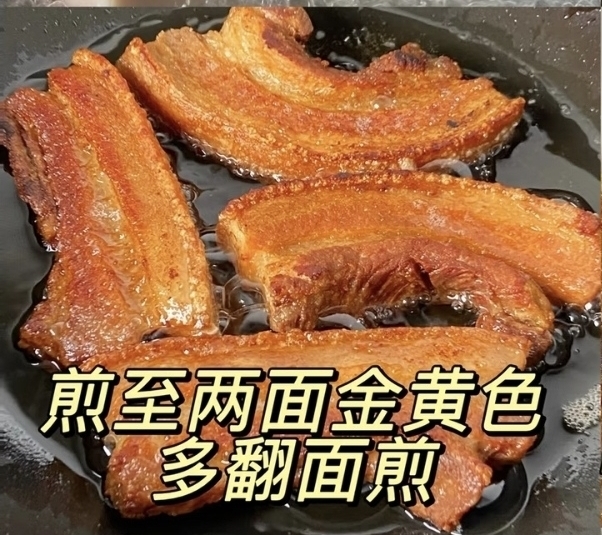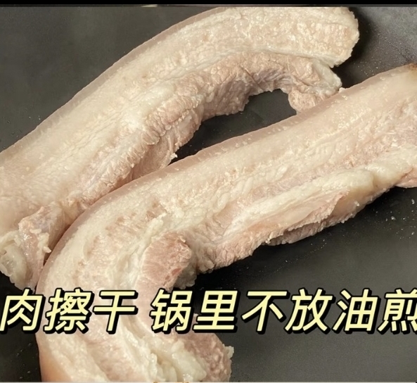 煮好的五花肉捞出后,最关键的一步就是擦干水分,必须用厨房纸巾反复按压,将表面的水分彻底吸干,水分越干燥,后续煎制时越容易形成焦脆的外皮,这是做出脆皮的核心秘诀。擦干后无需额外腌制,直接放入无油的平底锅,开中小火慢煎,利用五花肉自身的油脂慢慢加热,让油脂慢慢析出。煎制时要勤翻面,先煎肉面让油脂充分释放,再煎猪皮面,直到两面都变成诱人的金黄色,外皮变得焦脆硬挺,用筷子轻敲能听到清脆的声响,此时的五花肉已经香气四溢,整个厨房都弥漫着油脂的焦香。