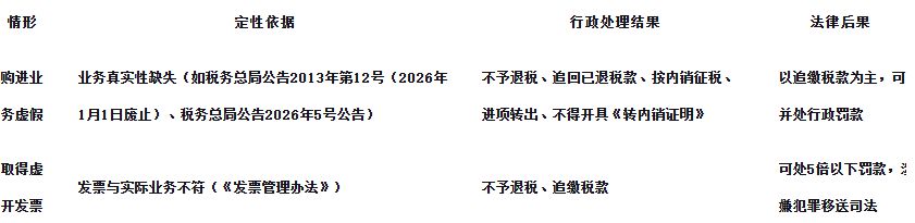 最新依据:《国家税务总局公告2026年第5号》(即新版《出口业务增值税和消费税退(免)税管理办法》)第五十七条,再次明确将“供货企业销售的外购货物、服务、无形资产,其购进业务为虚假业务”列为适用增值税征税政策的情形。