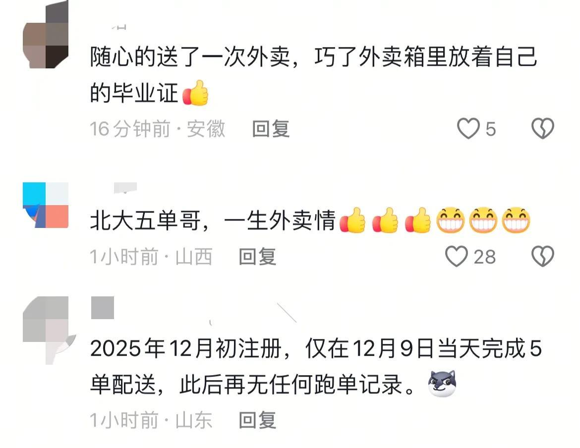 送外卖不丢人,高学历送外卖也不丢人。靠自己双手赚钱,堂堂正正,不管是博士硕士还是北大清华,只要踏实干活,都值得尊重。