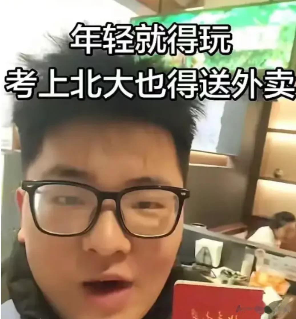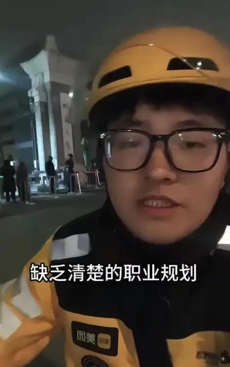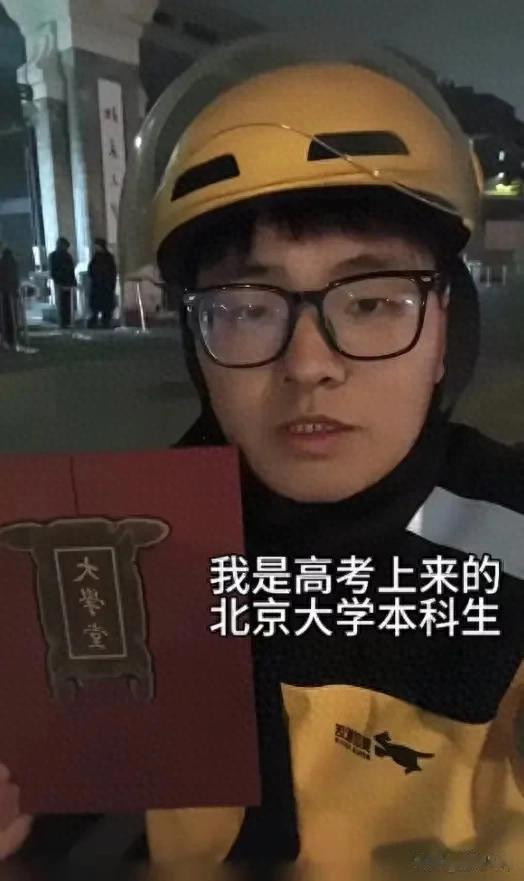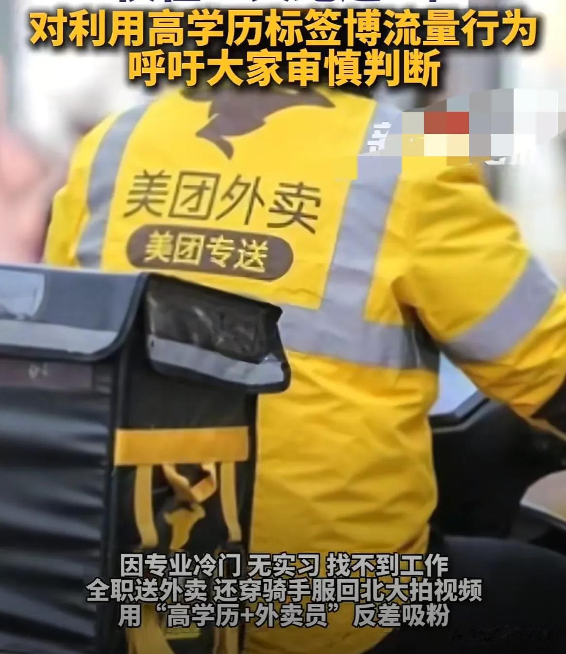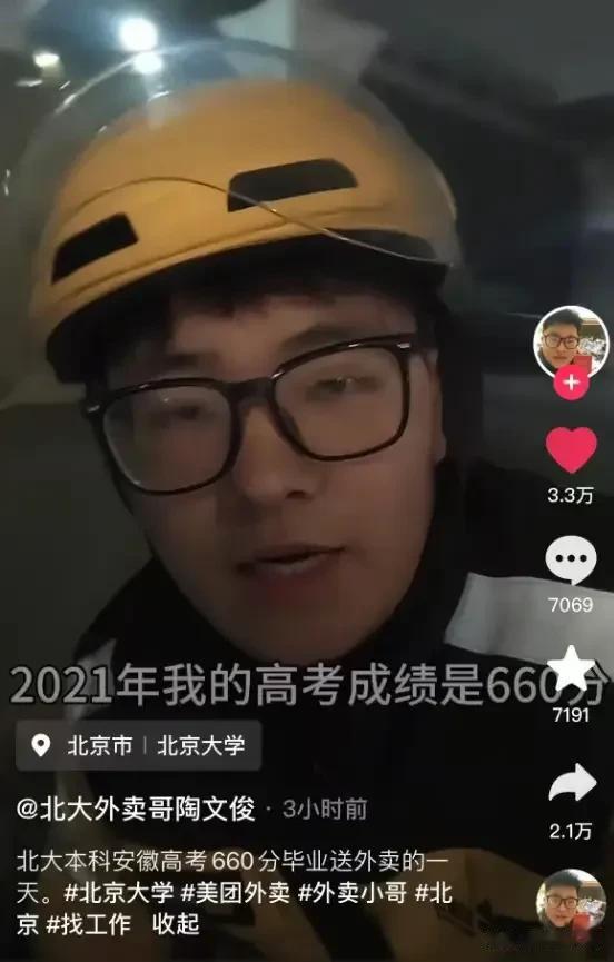 视频里他穿着外卖服,在北大校门口侃侃而谈,诉说着自己眼高手低,求职高不成低不就的巨大困扰,在家待业半年了,只能选择跑外卖谋生。