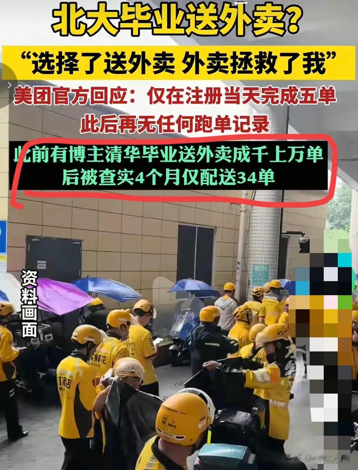高学历加送外卖的剧本已经不是第一次出现了,之前还有“清华毕业送外卖”的博主,说自己跑了多少单,辛苦得不得了。结果平台查证:四个多月,只跑了34单。