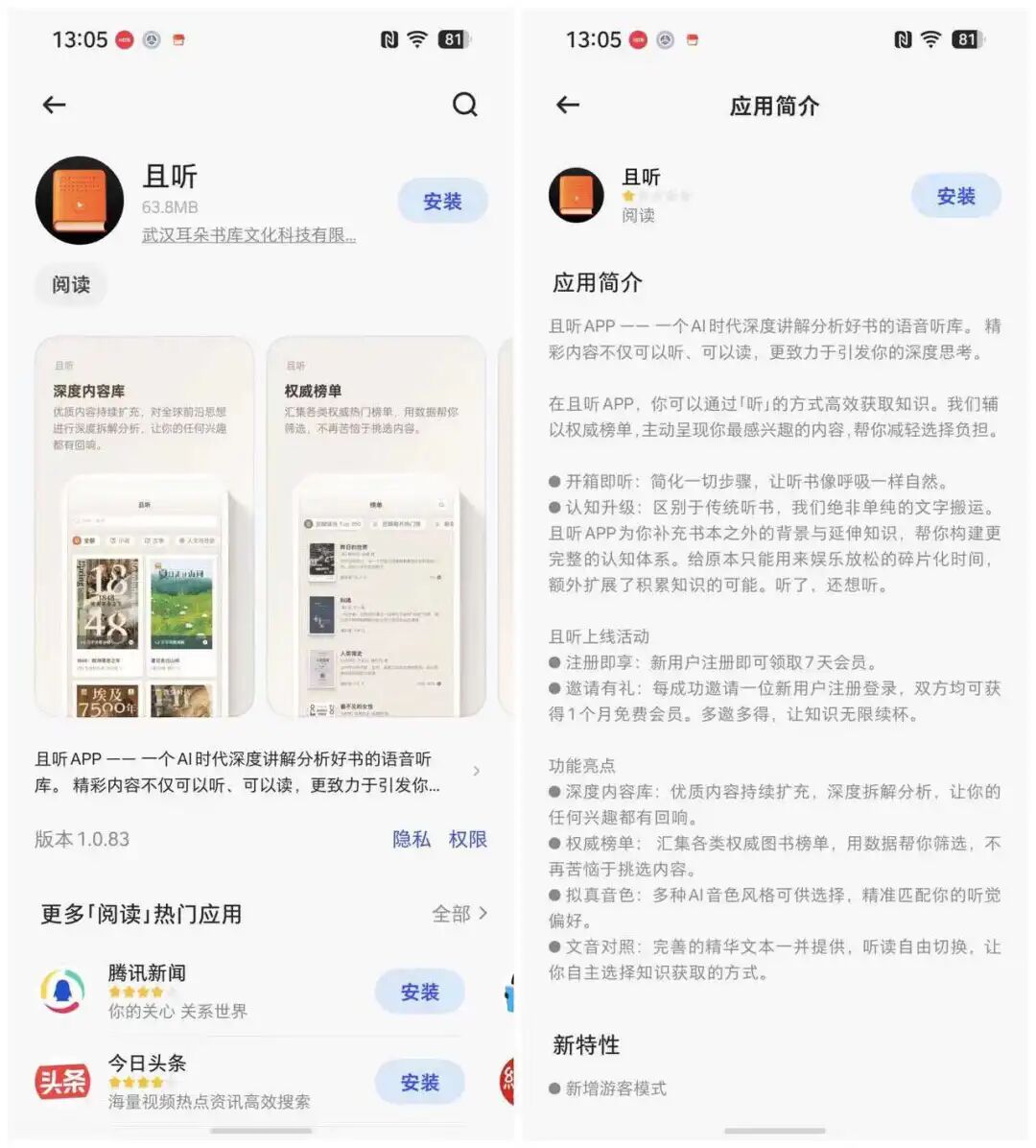 在对每本书的讲解中,且听会用约20%篇幅平衡不同观点,以及挑出书籍中的错误/偏颇之处。此外该App允许读者自定义语音,通过上传10秒以上的语音文件,且听就能为用户复刻出同款音色、语气,让喜欢的人物声音为自己“读书”。