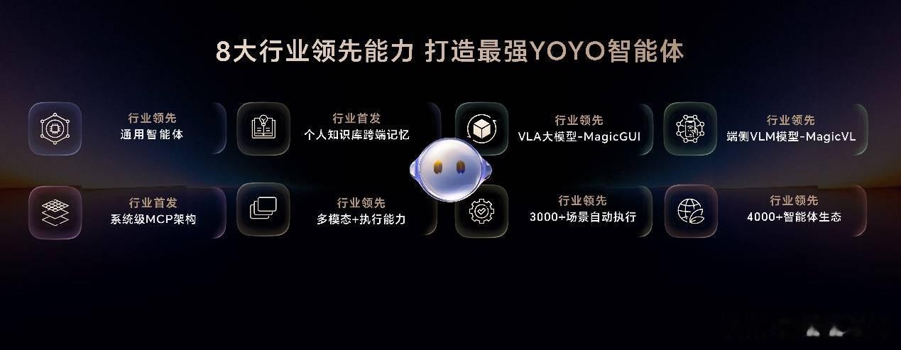 荣耀魔法大模型3.0,具有端云结合的大模型矩阵,在多模态理解、任务规划和工具调用等核心能力上,持续进化,紧密协同,达到比肩SOTA的业界顶尖水平。基于荣耀魔法大模型3.0的YOYO智能体,获得中国信通院L3级卓越型权威认证,代表了当前智能体泛化能力的最高水平。