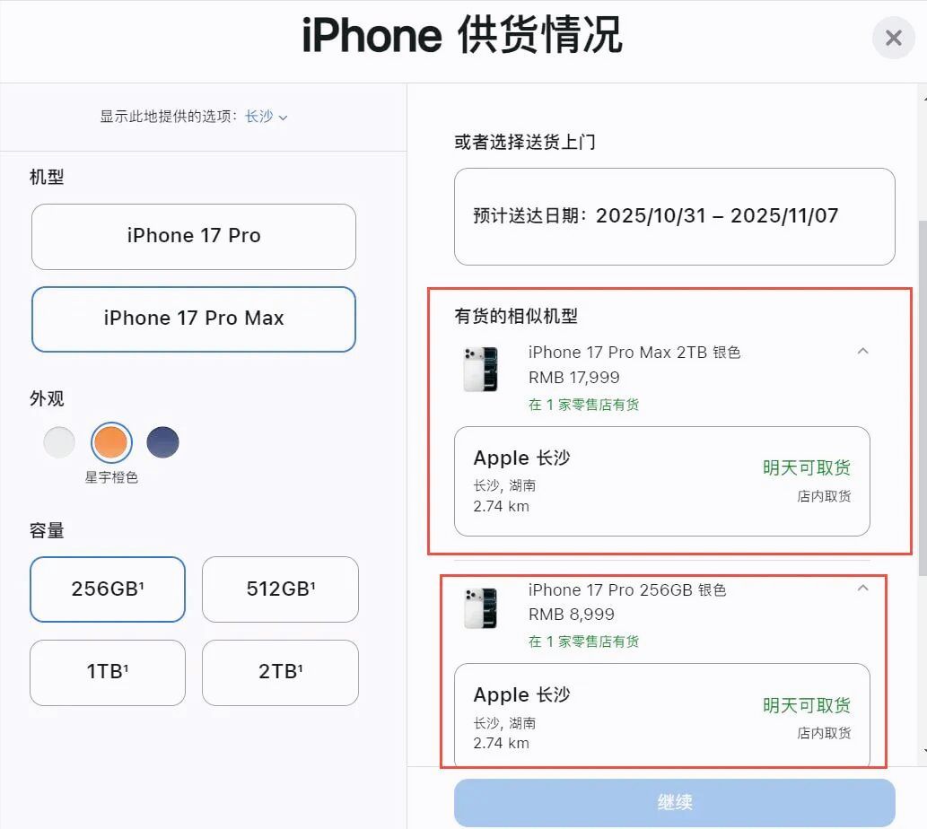 就拿湖南地区来说吧,如果在官网下单,iPhone17ProMax预计要到10月31日—11月7日才能到货。