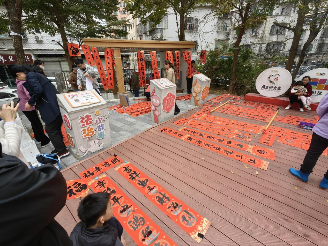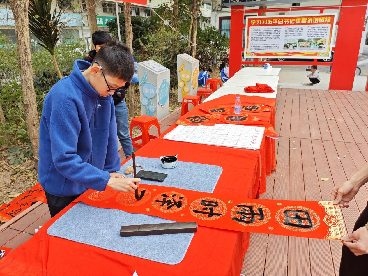 闻讯而来的居民早早排起长队活动现场,。红绸点缀的长桌整齐排开,大红宣纸铺展如霞,7数位来自黄斌武练字法及星辉浩瀚艺术教育的书法老师、3位社区书法爱好者与“小小书法老师”齐聚一堂,挥毫泼墨送祝福。。书法老师们笔走龙蛇,篆隶楷行各体端正、饱满的“福”字跃然纸上,“骏马奔腾庆新春,百福呈祥贺佳节”“喜居宝地财兴旺,福照家门富生辉”等吉祥春联新鲜出炉,联句对仗工整、意蕴悠长。