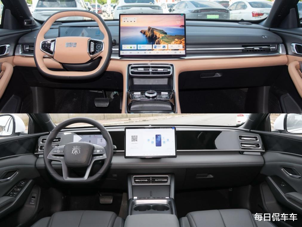 座舱内部,两者的仪表台和门板基本采用软性皮面覆盖,触感都不错。银河A7提供15.4英寸中控大屏和10.2英寸全液晶仪表屏,秦L采用12.8英寸中控屏和8.8英寸液晶仪表屏。银河A7的Flyme Auto车机系统除了有常规的车控与上网功能,拥有手车互联全家桶,手机打通更便利,还有多了智能壁纸、交互智能体、高德810导航等功能,在AI应用上更出色些,而秦L的车机在可玩性上略逊一些。