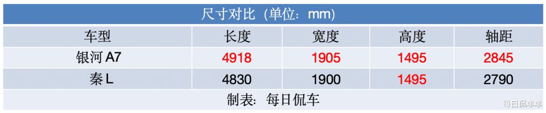 两车的尺寸都比较大,如果严格按照2800mm轴距作为中级车与紧凑级车的分界线,银河A7达到中级车水平,而秦L只能算偏大的紧凑级车,具体的车身尺寸对比表格见下图。外饰方面,秦L采用传统的大嘴格栅前脸和分体式头灯,看起来大气威武,但也多了些传统的“油腻感”。银河A7采用电车风格的封闭前脸,有贯穿式灯带,显得更时尚年轻,夜间的辨识度也更高。