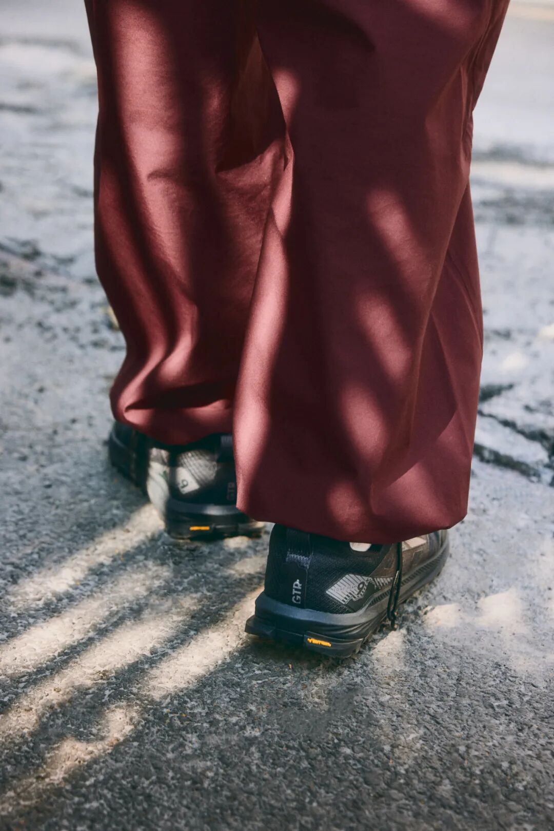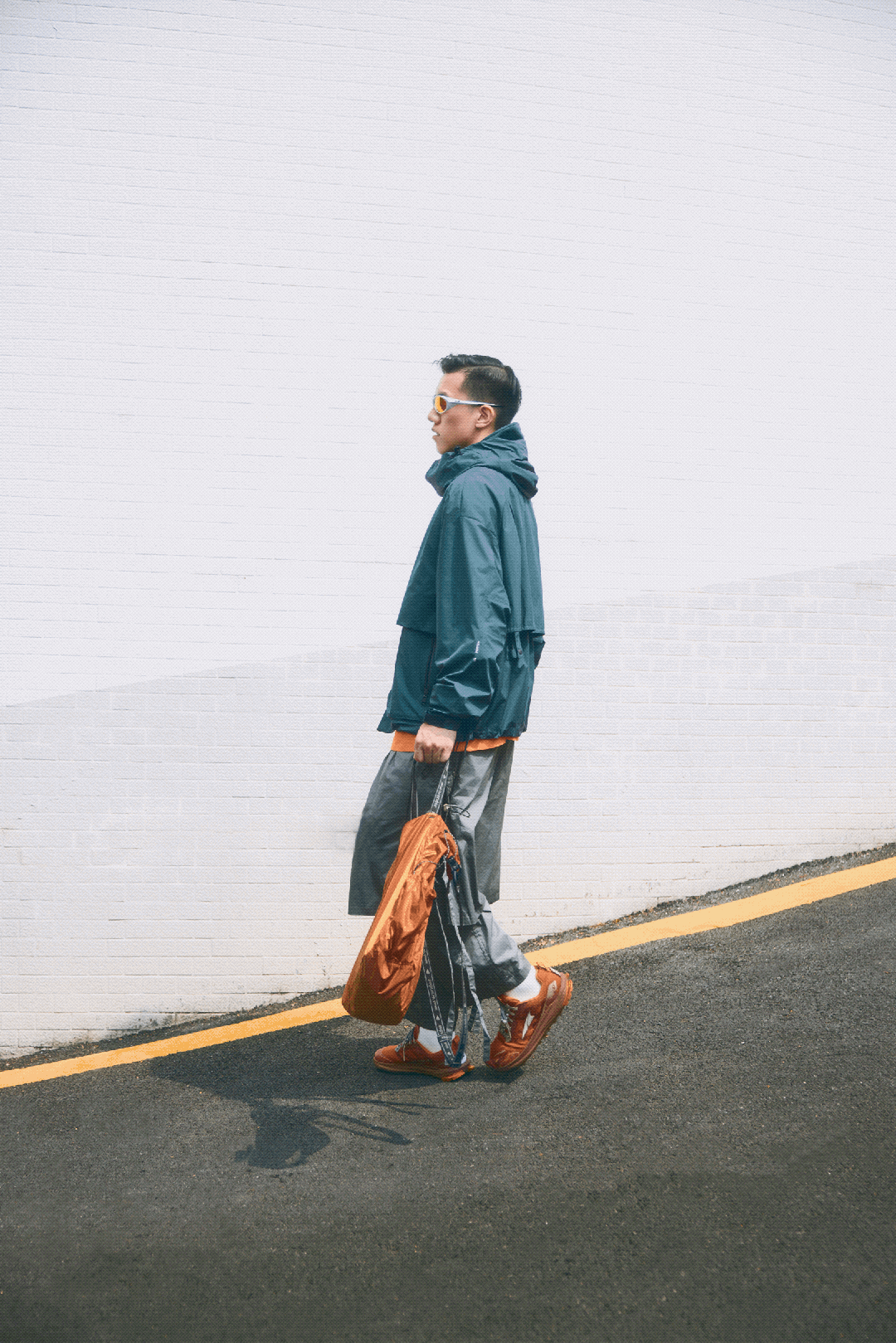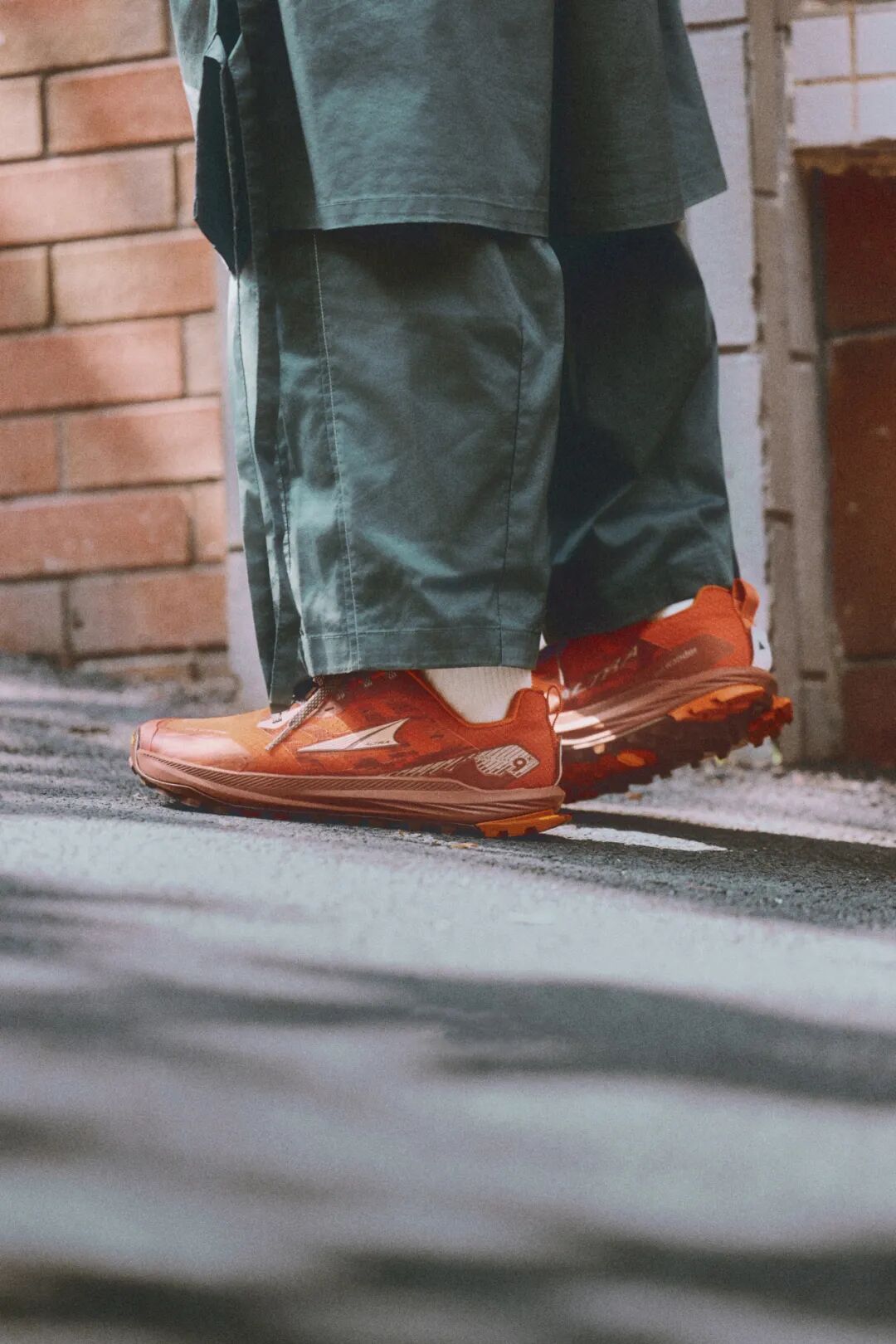 作为 Lone Peak 鞋款的第一次对外合作,鞋款独特的外观设计源于 and wander 的山系美学理念。我们顺势以此为穿搭灵感,由绿色冲锋衣搭配同色系的阔腿工装裤,同时在内搭的衬衫、运动眼镜、包袋单品上,都采用与鞋款颜色呼应的橙色。造型层次感有了,户外先锋 Vibe 有了,城市日常实穿性有了。尽管上下半身的搭配已经十分出彩,但整体造型的视觉重心,依然是鞋子。