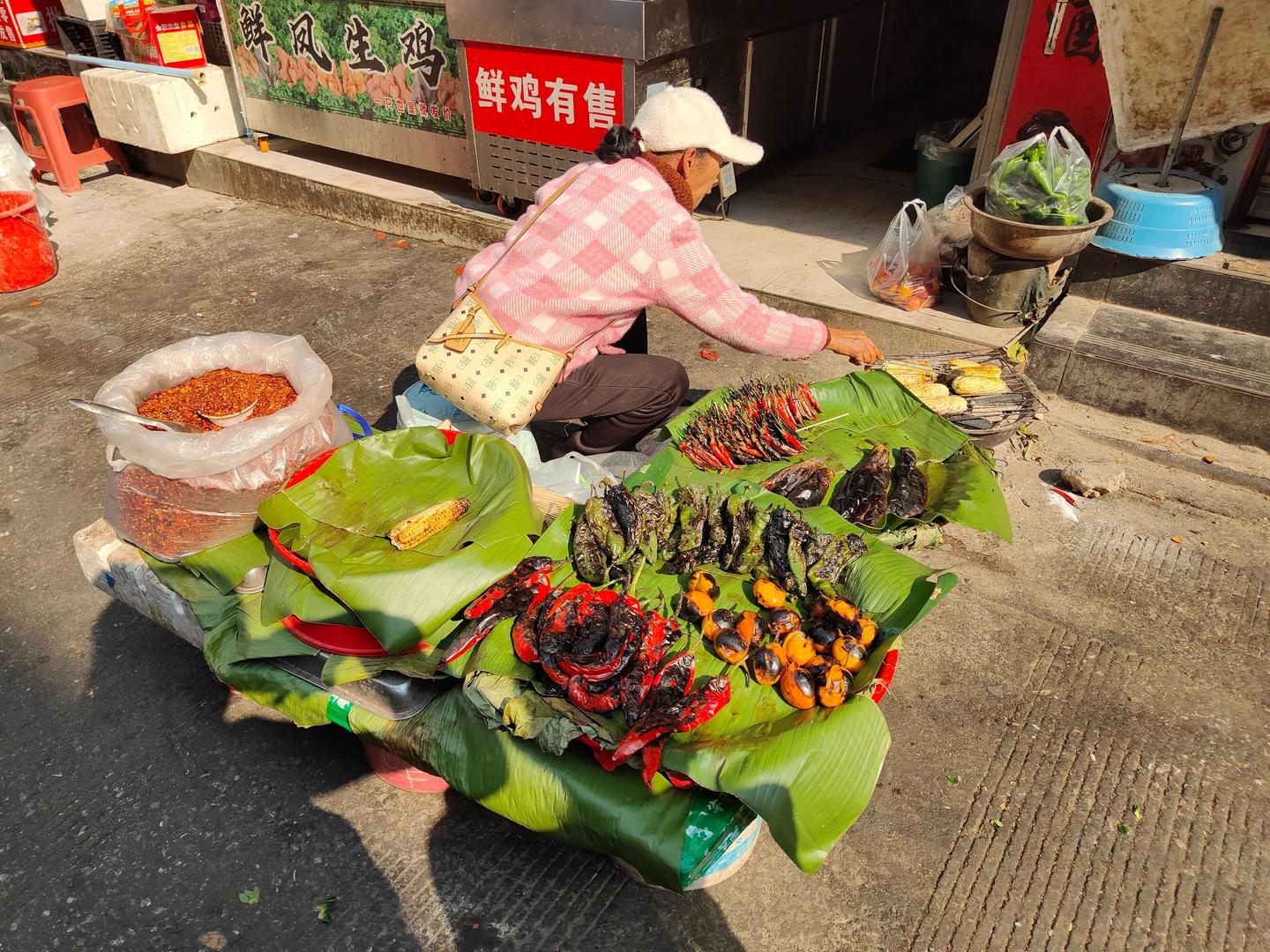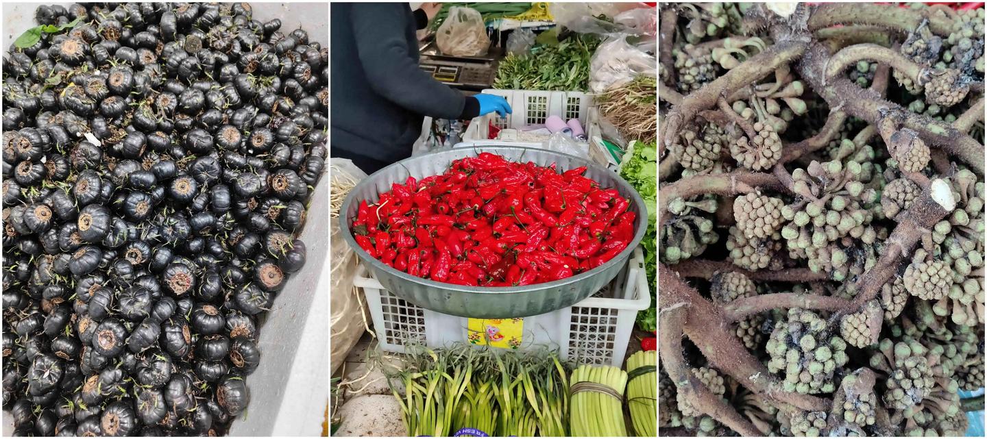当然 还有10%的可能没有见过,第一个图的是红参果,看着有点像蓝莓的亲戚,实际上口味,我不太喜欢,第二个应该是刷刷辣,那种在水里刷两下,整碗水都是辣味。也有一些没有见过的植物,看看眼界还是可以的,市场外围的地方卖的东西可能相对会便宜一些,但个人感觉整体还是较云南其他地方贵不少。下图的烤辣椒茄子,贵州常见,云南不常见,不过一个茄子快20元,感觉有点吃不起。