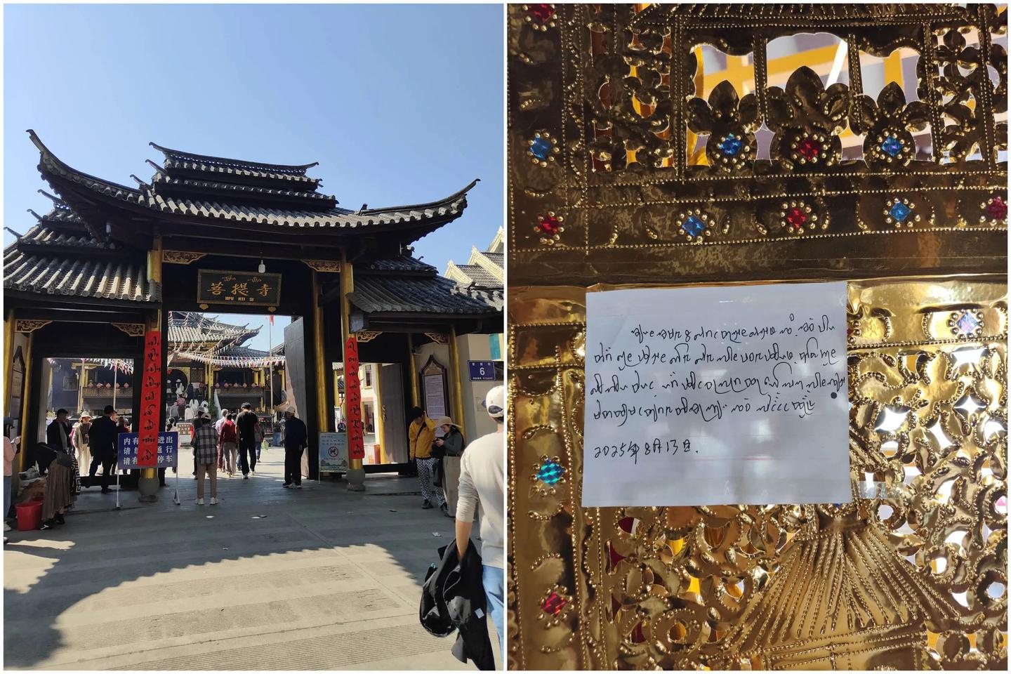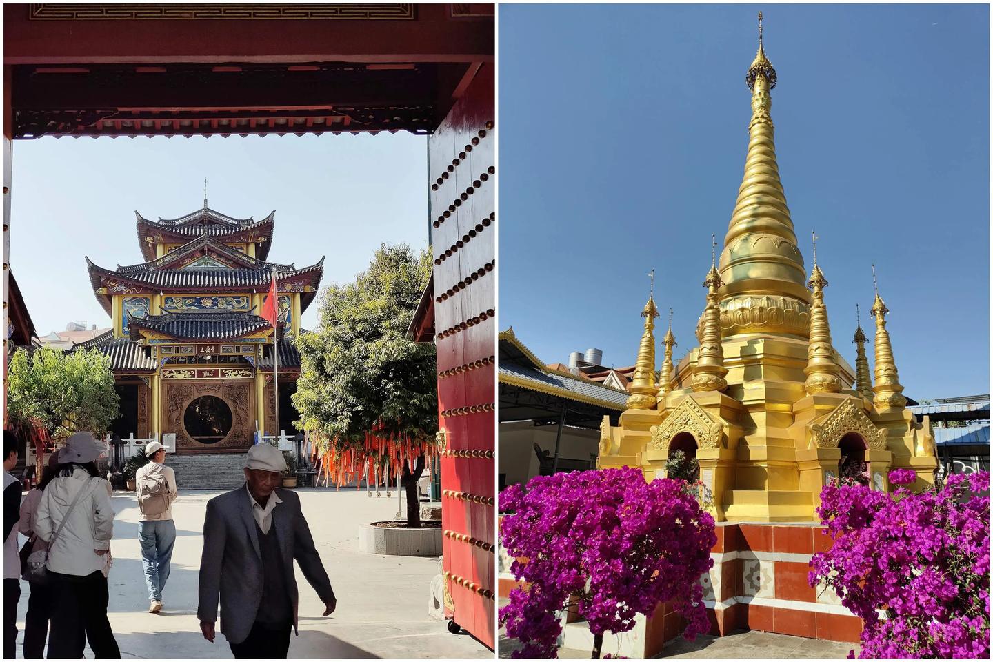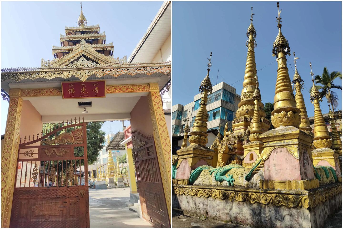 然后是芒市里面比较有名的三个庙,第一站是菩提庙,游客很多。要说一句的是,很有有人在庙前的马路中间拍照,说什么东南亚棕榈树风情,罔顾交通安全,为了打卡置自己和车辆不顾,值得吗?至于扫描,经历昨天瑞丽的德宏佛学院的恢弘,这边的就小巧精致一点吧。