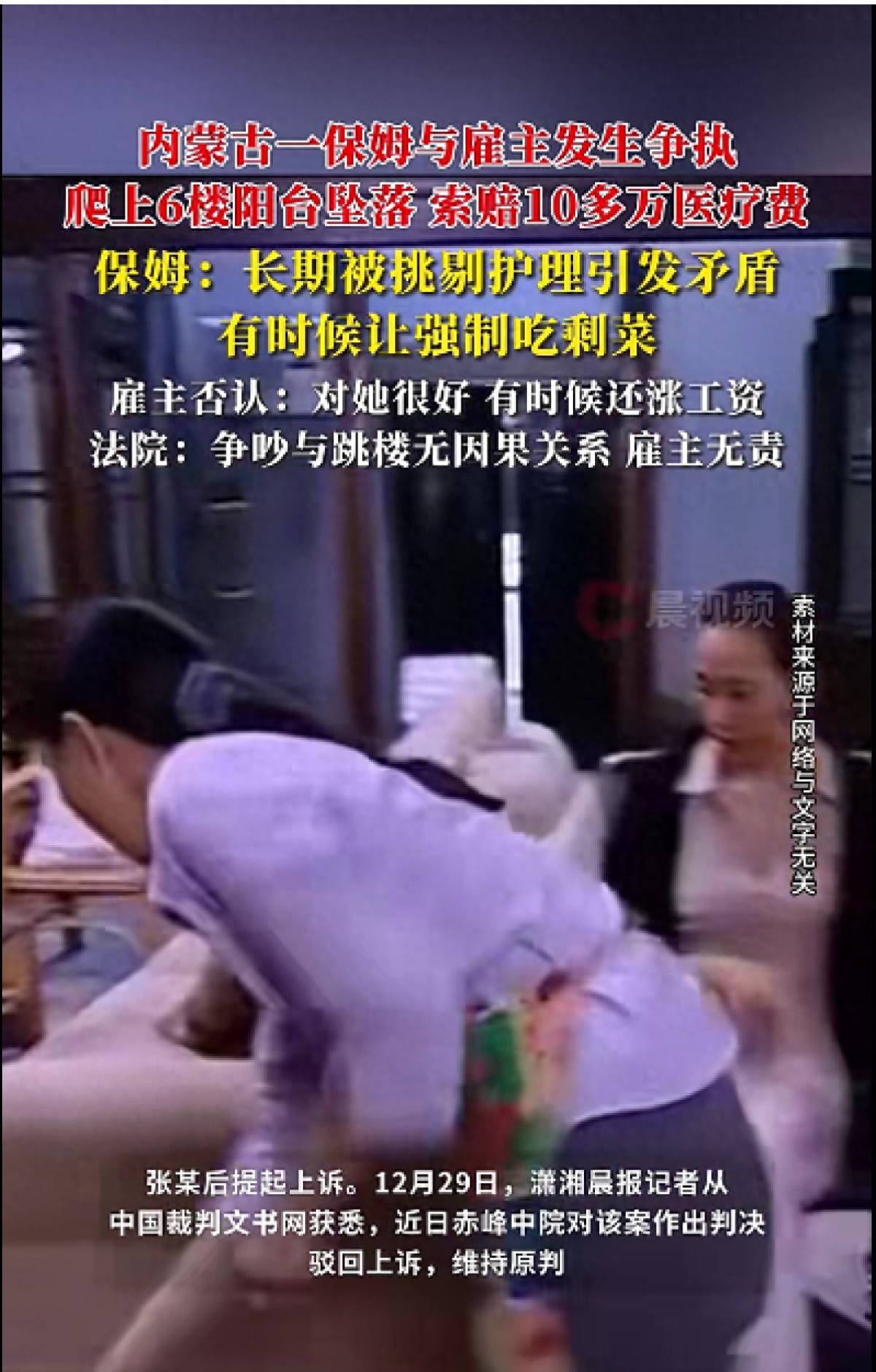 今年年初,内蒙古赤峰市一名48岁保姆张某在与雇主杨某发生争吵后,将一只腿从阳台护栏的上方跨越,后从6楼坠落致伤。