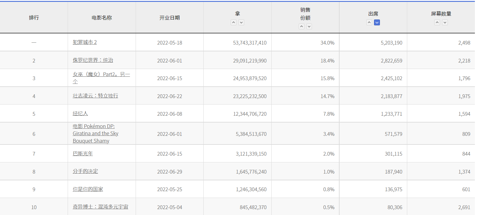 看看今年他们的票房排名情况。