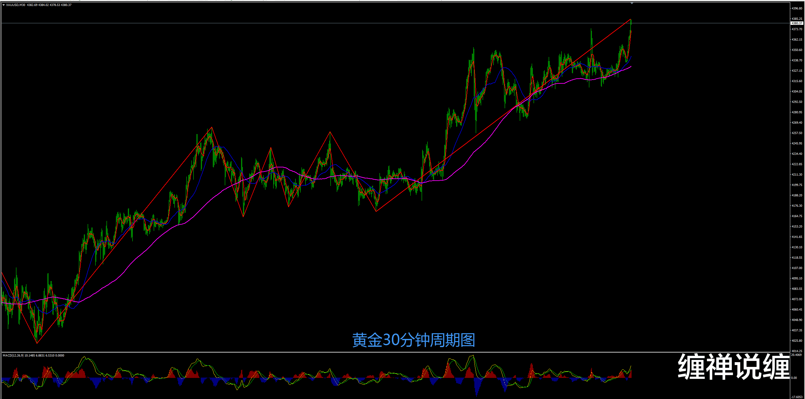 黄金30分钟上涨延续,黄金短线回撤不破4336,那么黄金30分钟就还是在延续上涨的过程中,黄金短线回撤还是继续顺势多,黄金回撤4336上继续逢低多。黄金短线突破历史新高之后开始徘徊,那么黄金先耐心等待回撤机会再顺势多。黄金避险再创历史新高,短线回撤顺势多!