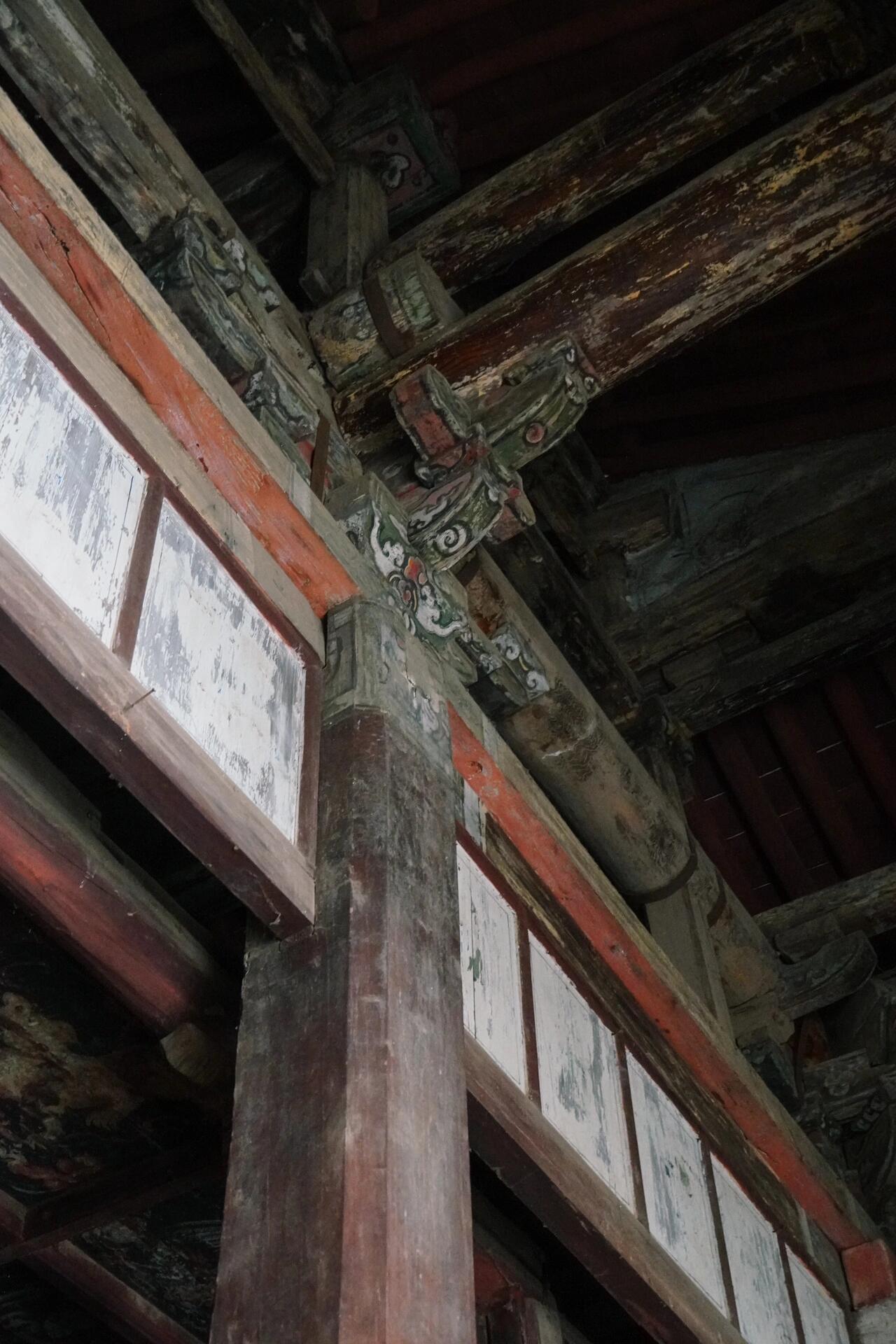 梁架上的"蜀柱承平梁"结构充满建筑张力。蜀柱底部的"合沓"刻成莲花形,既增强稳定性,又赋予力学构件以美学价值;平梁之上的"叉手"与"托脚"构成三角形网络,将屋脊荷载分解为45度与60度两个方向,这种多向受力体系,比欧洲中世纪的桁架结构早了150年。当阳光穿过直棂窗,在梁架上投下斜切的光影,那些裸露的木构宛如金代工匠留在时空里的速写线条。