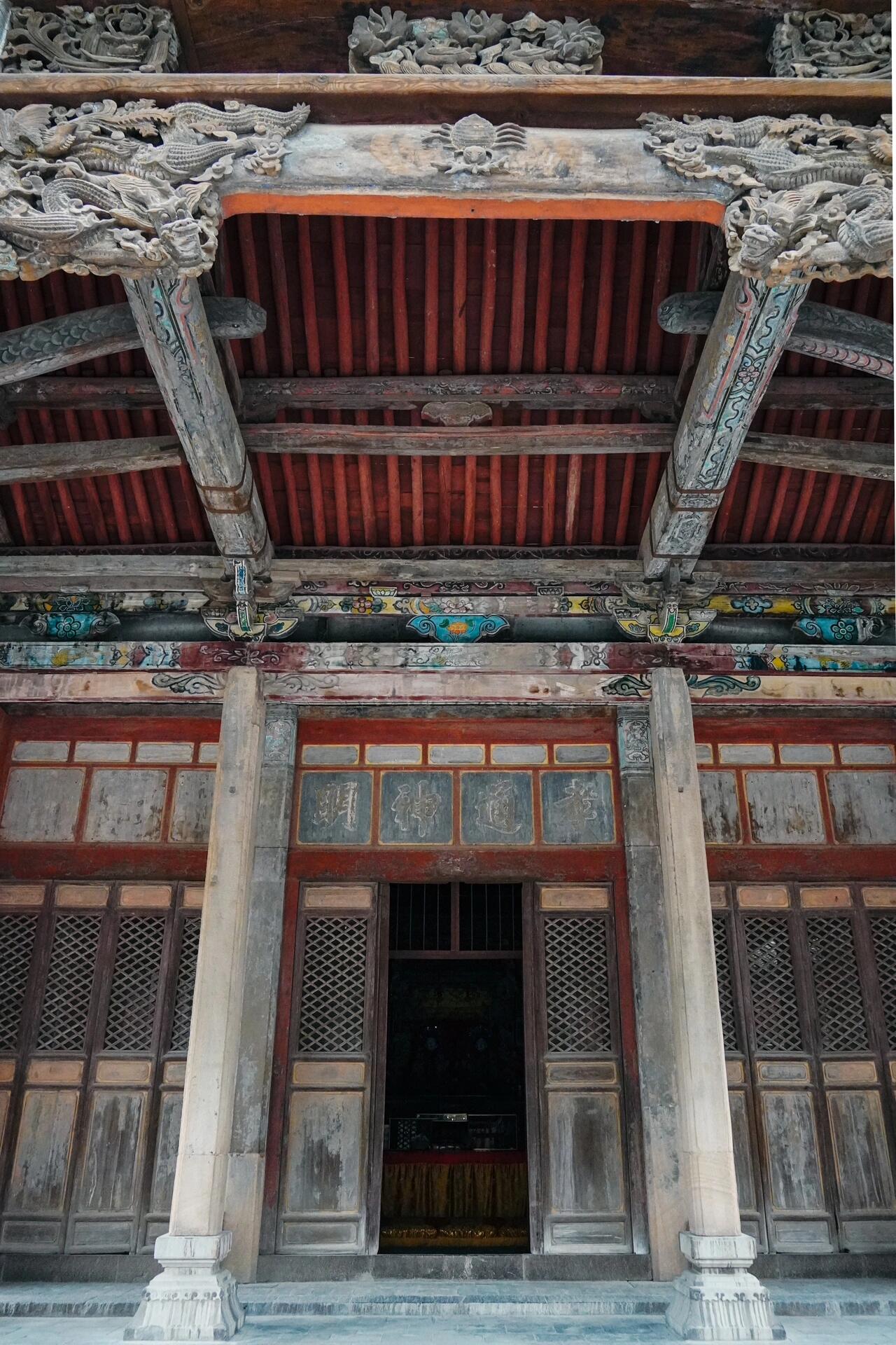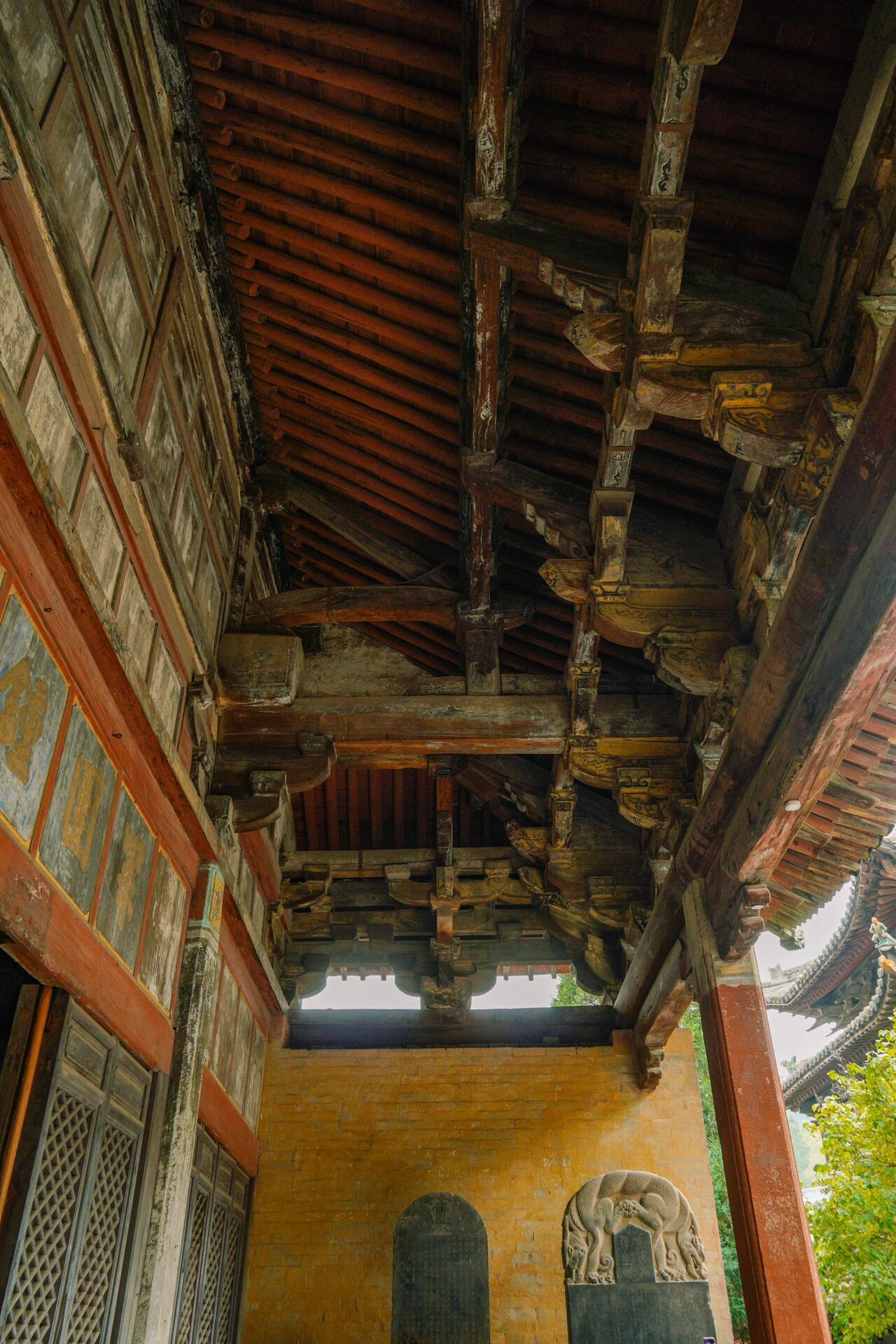 正殿的单檐歇山顶是金代木构的抒情诗篇。四椽栿与乳栿的搭接节点采用"勾头搭掌"做法,这种源自北方民居的简易榫卯,被工匠改良为承重构件,实测可承受8吨屋面荷载。前檐的五铺作重下昂斗拱堪称力学教科书:下昂的后尾挑起平榑,形成"杠杆式"受力体系,昂尖的"批竹式"造型既符合《营造法式》规制,又在截面中部刻出凹槽,形成"柔化"视觉效果,刚柔并济的处理,暗合道家"负阴抱阳"的哲学。