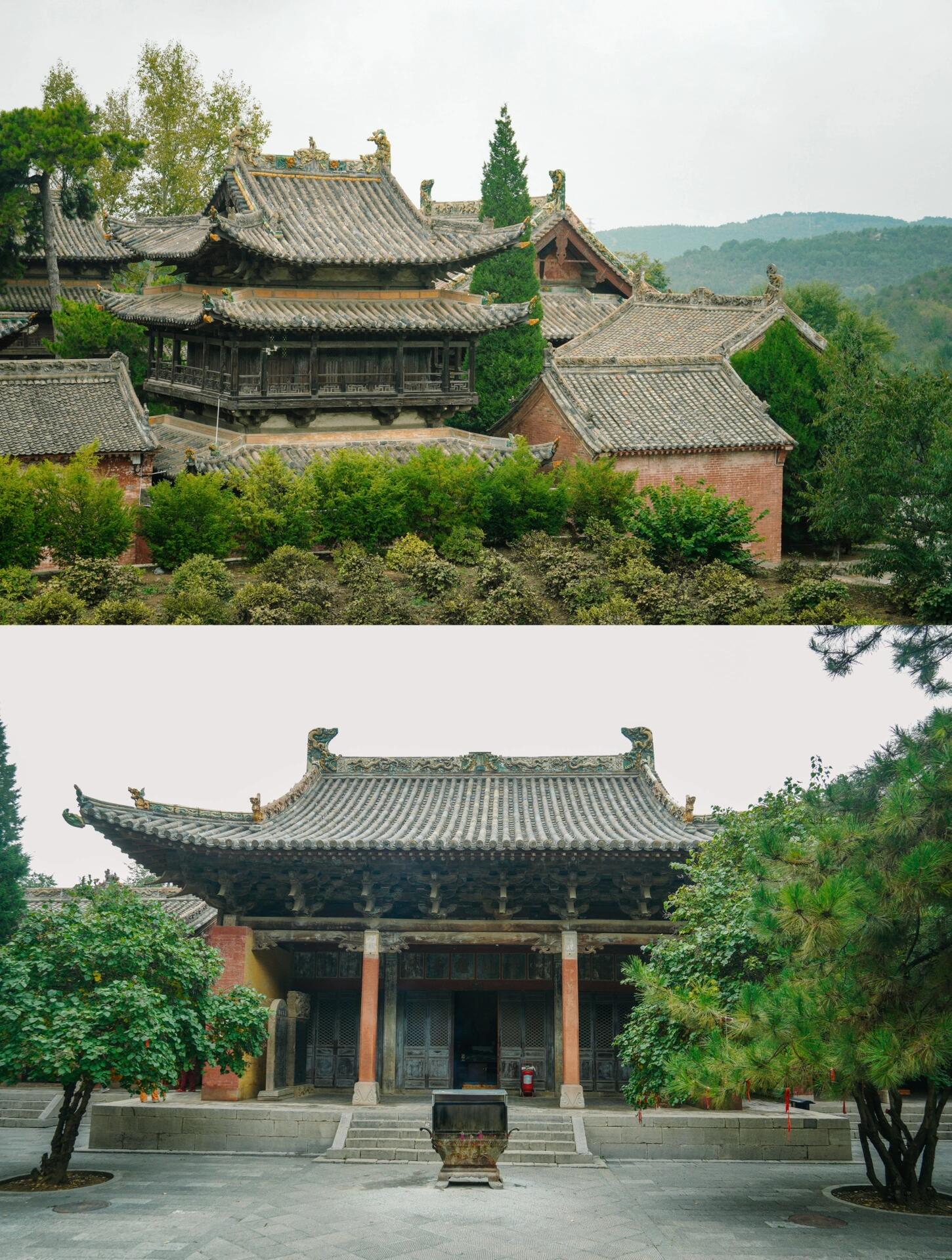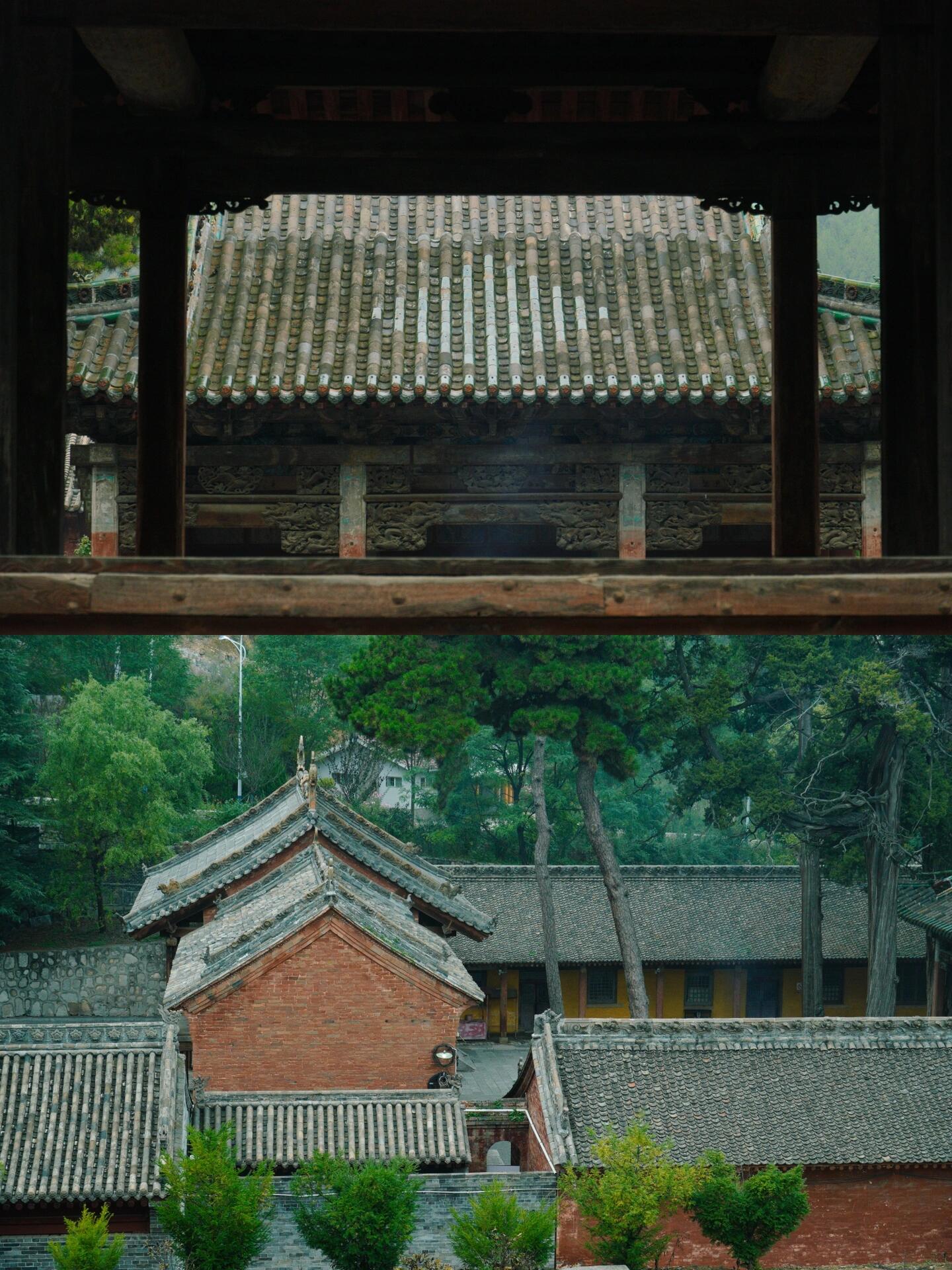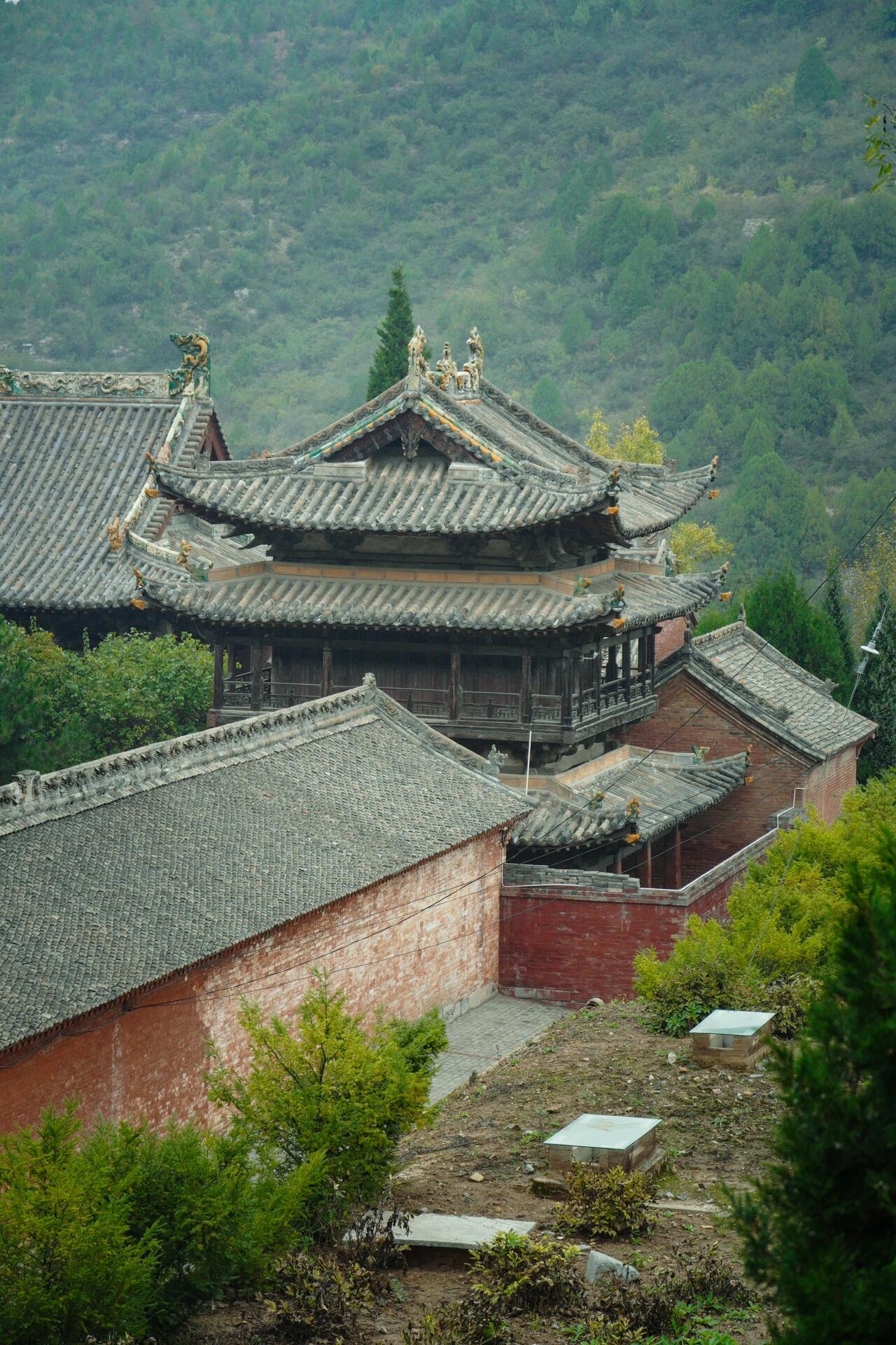晨雾中的建筑呈现出特殊的透视效果。山门戏楼的翼角在雾中若隐若现,与远处的山峰轮廓形成"虚实飞檐"的对话;金代楼阁的琉璃脊饰在水汽中折射出虹彩,与溪谷中的晨露形成"天上人间"的镜像。这种"雾中看庙"的体验,暗合宋代山水画的"米氏云山"技法——建筑不再是固态的存在,而是与云雾、流水、草木共同构成的动态画卷。