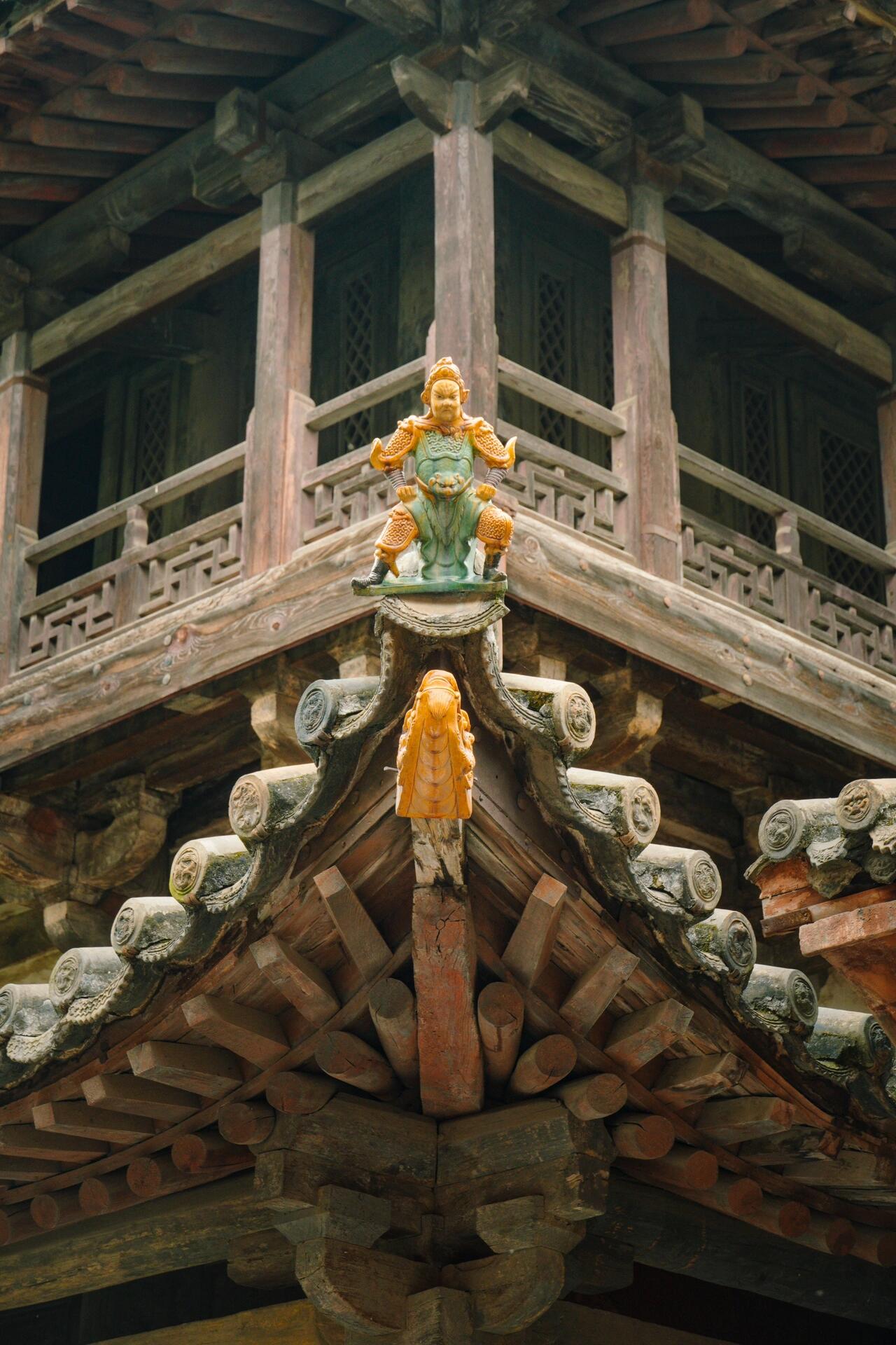 西梳妆楼的金代遗风藏在细节里。二层的平座栏杆采用"寻杖绞角造",转角处的望柱刻有女真族的"海东青捕雁"纹样,这种将民族图腾融入建筑的做法,比同期中原建筑更具边疆活力。顶层的四椽栿通檐而过,表面保留着斧凿的"V"形痕迹,工匠刻意不做打磨,让木材的天然纹理成为最美的装饰,这种"粗材细作"的理念,与金代磁州窑的"白地黑花"工艺形成美学呼应。