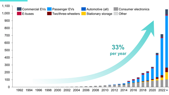 电池出货量快速增长在下图中,横轴显示年份,纵轴显示全球出货的电池总电量 (GWh)。 电池出货量每2~3年翻一番,年均增长率为33%。在确认了发货地的领域后,我们发现特别是以电动汽车(深蓝色和淡蓝色)为对象的发货占了很大的比例。