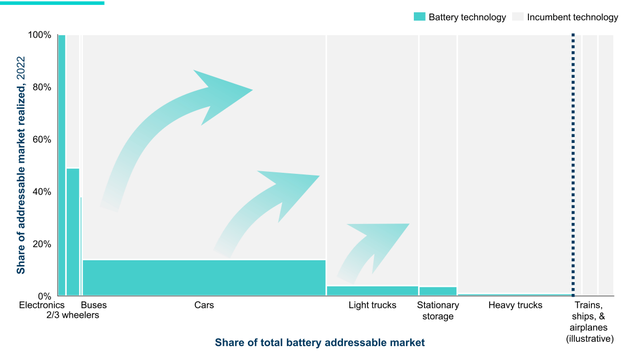 RMI将“随着电池成本的下降和能量密度的提高”和“一个市场走向电池电动化的行为带来了规模和技术进步,从而推动了下一个市场的发展”的现象称为“电池的多米诺骨牌效应”。 下图显示了在“两轮车和三轮车”、“公共汽车”、“私家车”、“小负载能力卡车”、“储能系统”、“大负载能力卡车”、“火车、轮船、飞机”中的采用电池车型的比例。 RMI指出,“电池技术首先应用于消费电子产品,然后是两轮车、三轮车和汽车。现在,卡车和电池储能也将紧随其后。到2030年,电池也可能在航运和航空领域占据市场份额。”