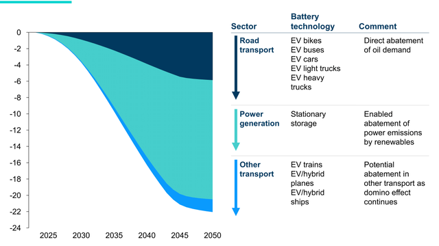 图表6:电池实现的二氧化碳减排,GtCO2/y减排与当今排放量的对比