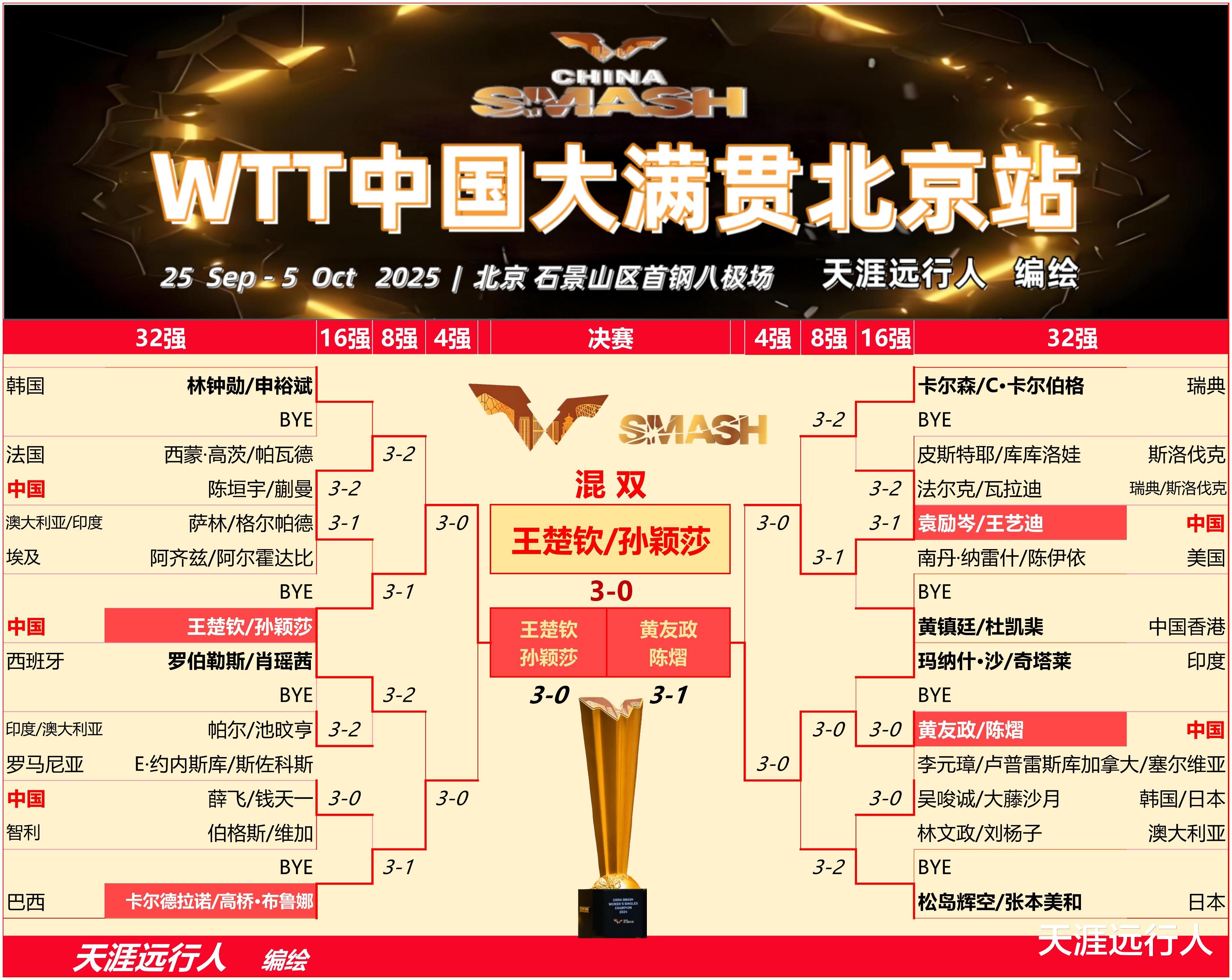 王楚钦/孙颖莎,国乒德比战以3-0(11-8,11-9,11-9),力胜队友黄友政/陈熠,王楚钦/孙颖莎获得WTT中国大满贯混双冠军,黄友政/陈熠获得亚军。
