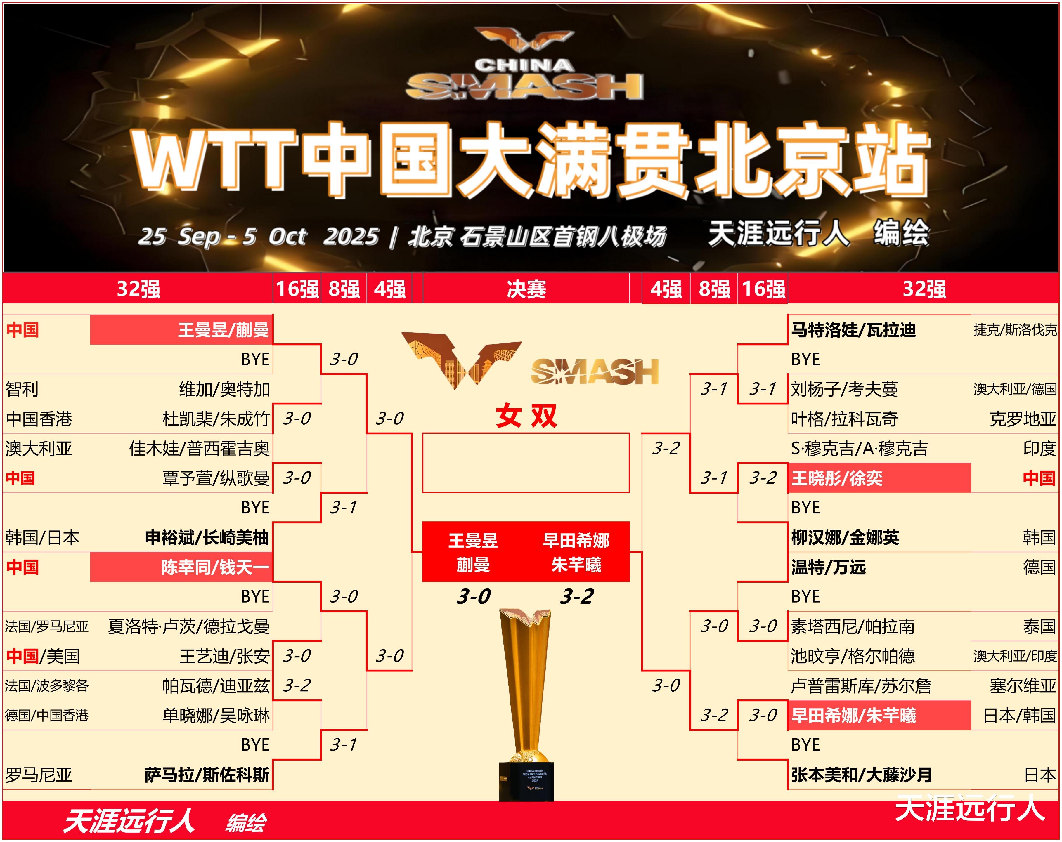 女子双打半决赛,王曼昱/蒯曼德比战胜陈幸同/钱天一,王晓彤/徐奕不敌日韩组合早田希娜/朱芊曦,王曼昱/蒯曼决赛对战日韩组合。