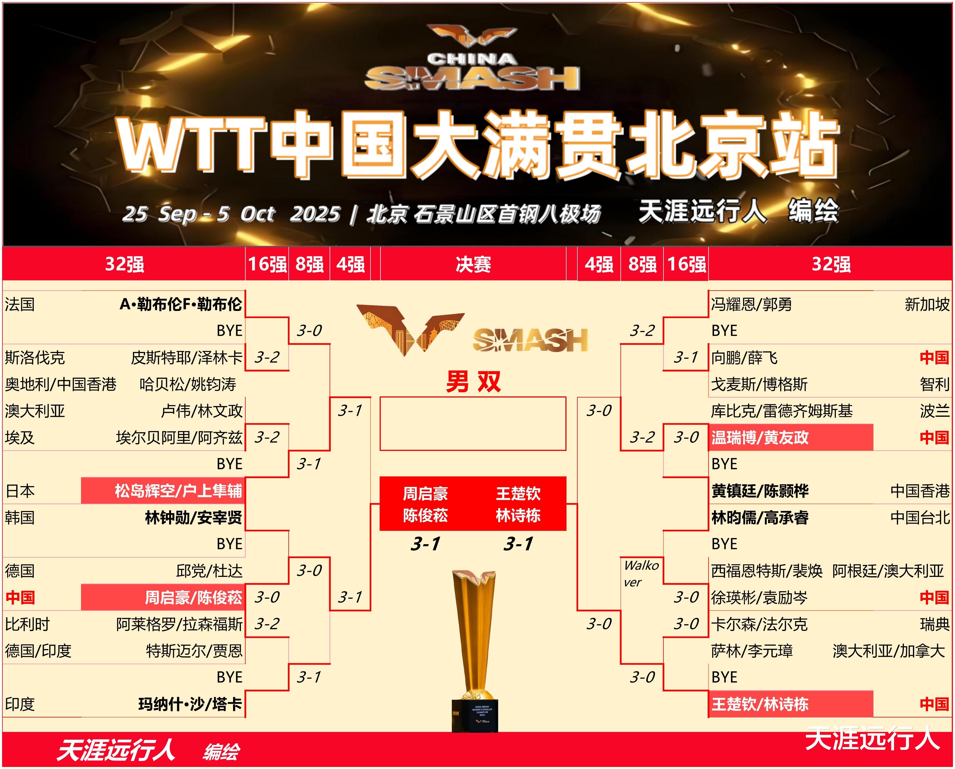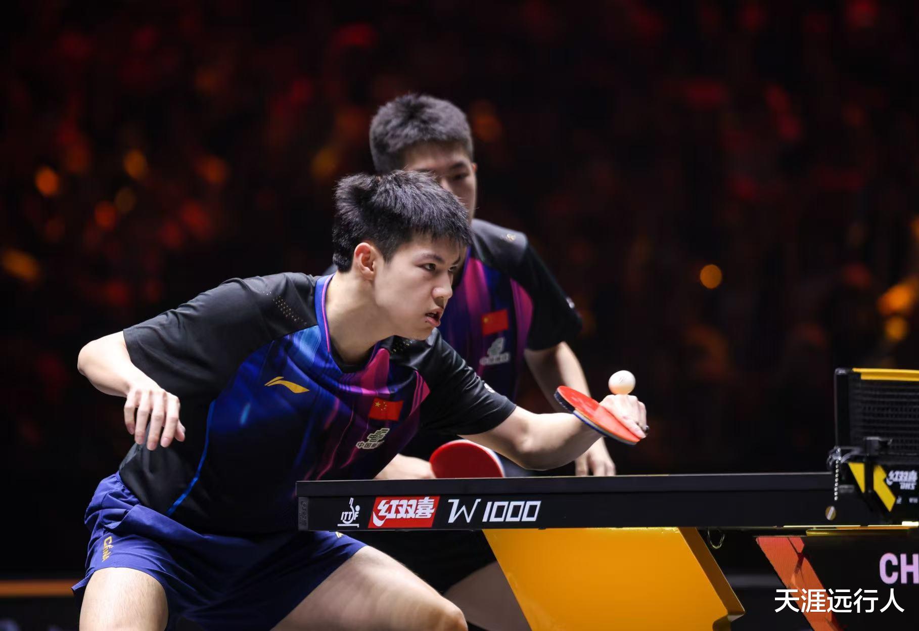男子双打半决赛,王楚钦/林诗栋德比战胜队友温瑞博/黄友政,周启豪/陈俊菘以3-1力克日乒户上隼辅/松岛辉空,强势挺进决赛,国乒包揽冠亚军。