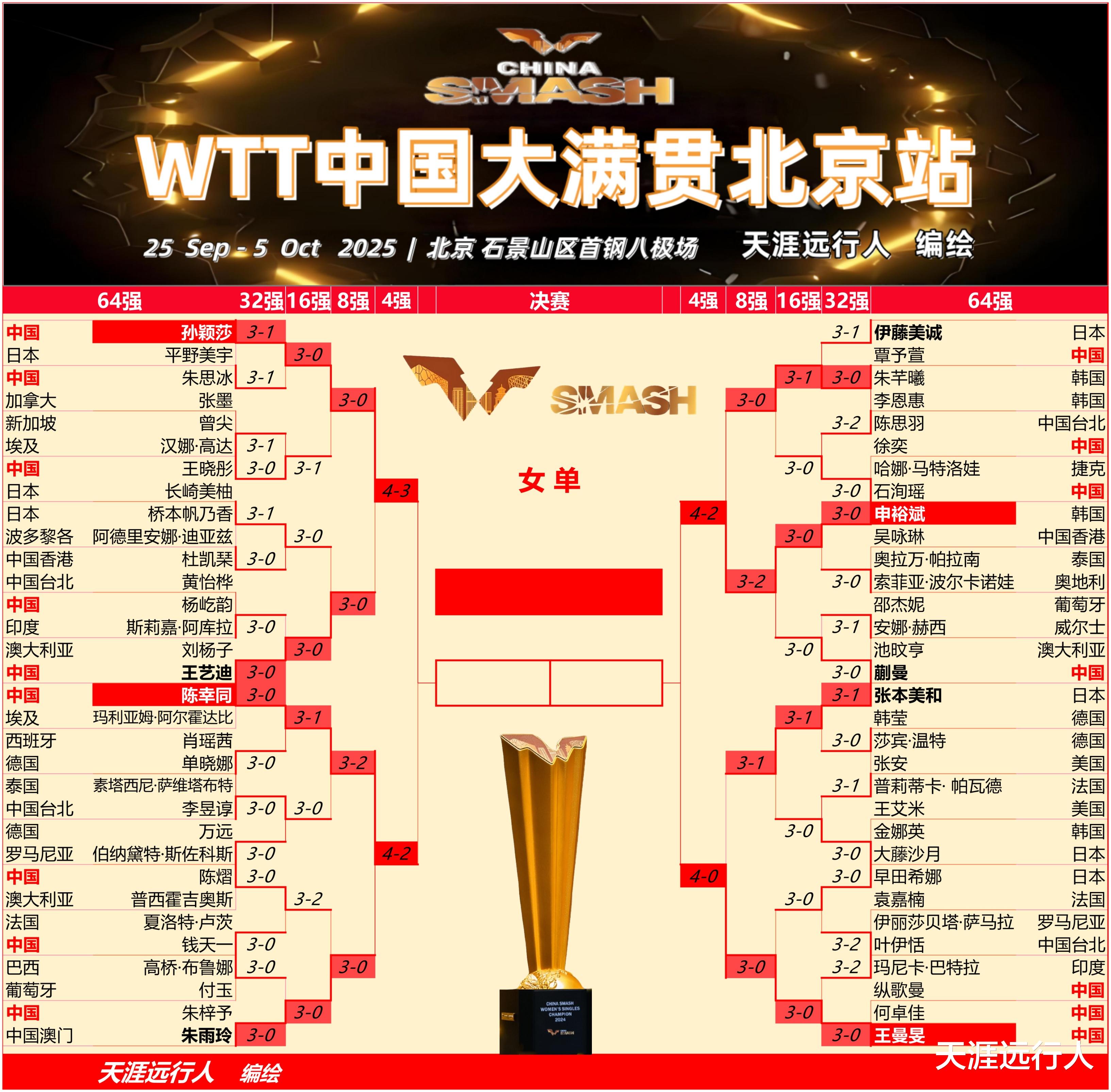 王曼昱,以4-0(11-3,12-10,11-6,11-4),力克日本一姐张本美和,保持对其全胜的战绩,下一轮的半决赛对阵韩国一姐申裕斌。