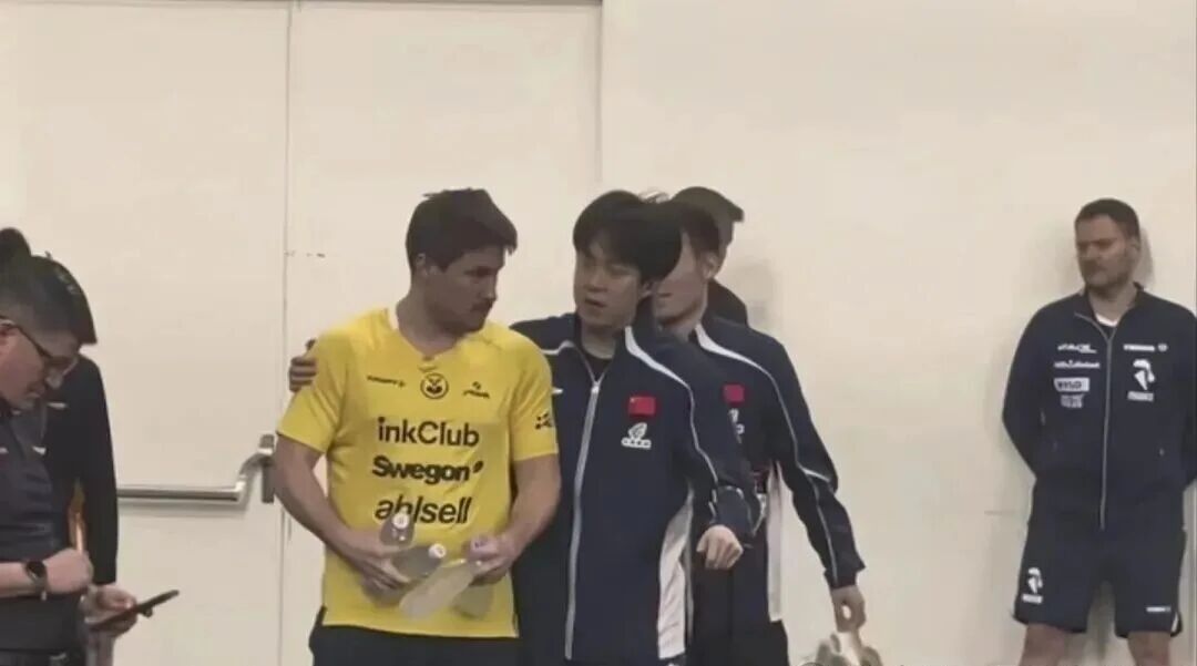 原来训练间隙,他们碰到了瑞典选手卡尔松。为表亲昵,王楚钦也是右手握住卡尔松胳膊,微笑着他交流。