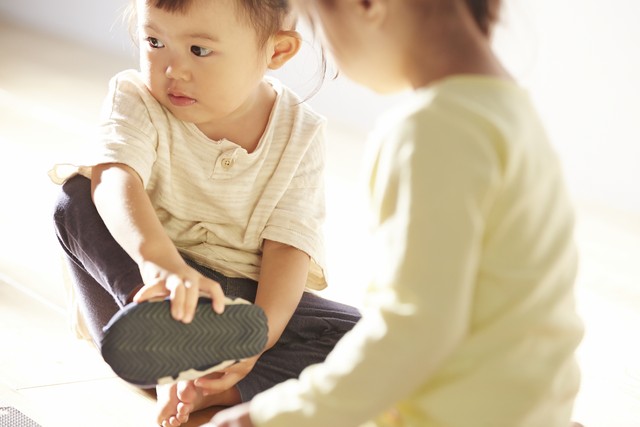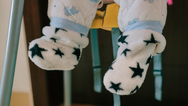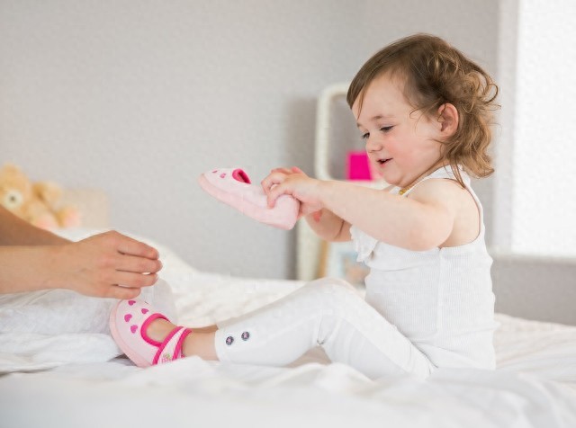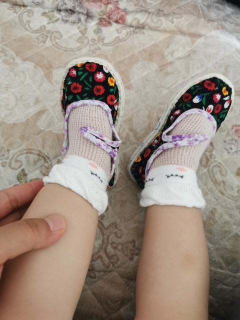 如果环境不适合光脚,可以给宝宝穿袜子或者软底婴儿鞋,起到防护和保暖的作用,不过这个鞋底一定要薄且柔软,鞋身柔软、透气,鞋子的形状要像脚的形状。