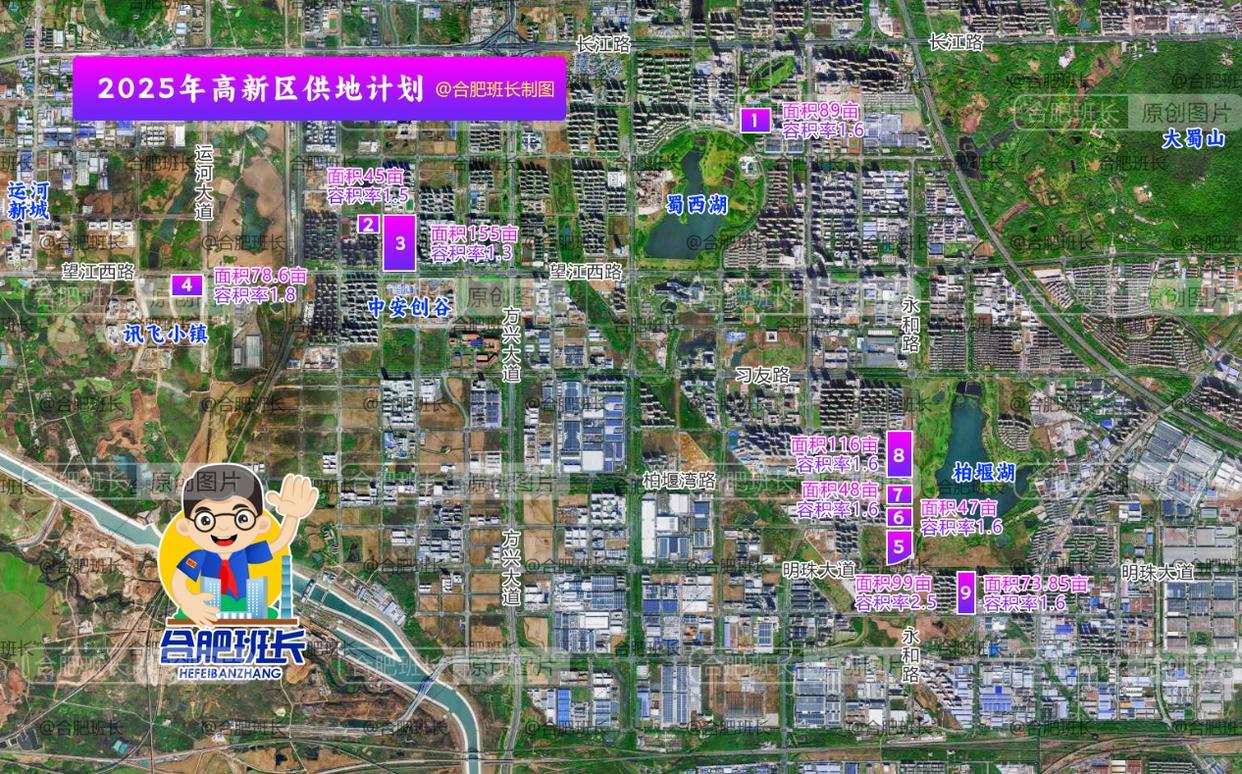 下面再和大家简要介绍一下高新区2025年供应计划,2025年高新区计划供应9宗涉宅用地,分别位于中安创谷、蜀西湖、讯飞小镇和北雁湖片区,目前中安创谷、蜀西湖3宗地块已成功出让,讯飞小镇片区1宗、北雁湖片区5宗居住用地待供应。